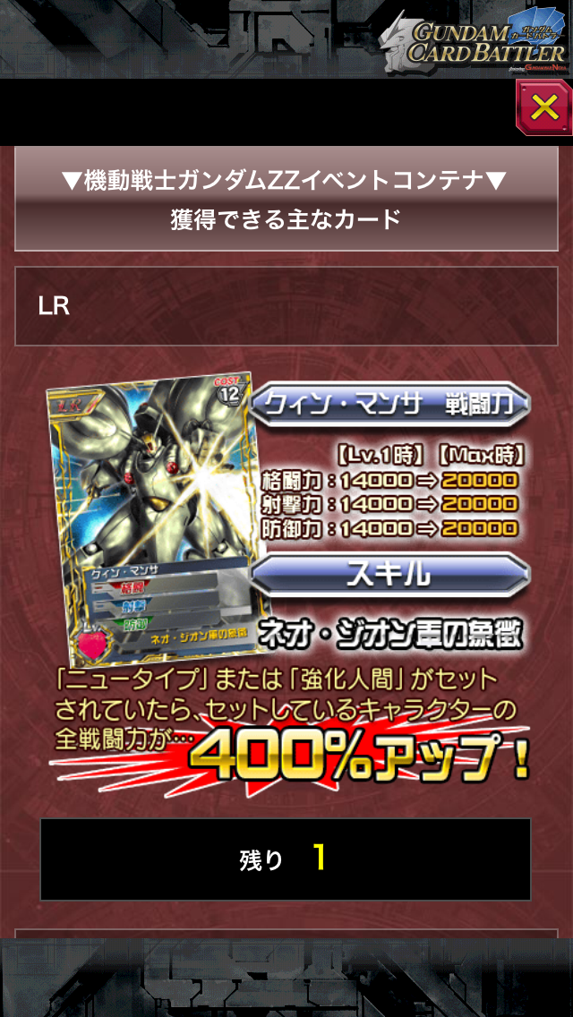 第1次ネオジオン抗争 始まりましたZZイベント 前はパフェ&薔薇イベントだったなーと思ってれば やっぱりパフェかい! 気になるのがパフェ獲得数ランキング これ00の時と一緒じゃないの? 普通に撃墜数でいいのに… そして今度は赤のLR登場 残るは黒、茶なので次のイベントは茶かな? 今回は青赤イベントなので頑張りたいのですが カプセルがランキング狙うほど残っていないので 細々とコンテナ掴みに精を出します [0回]PR