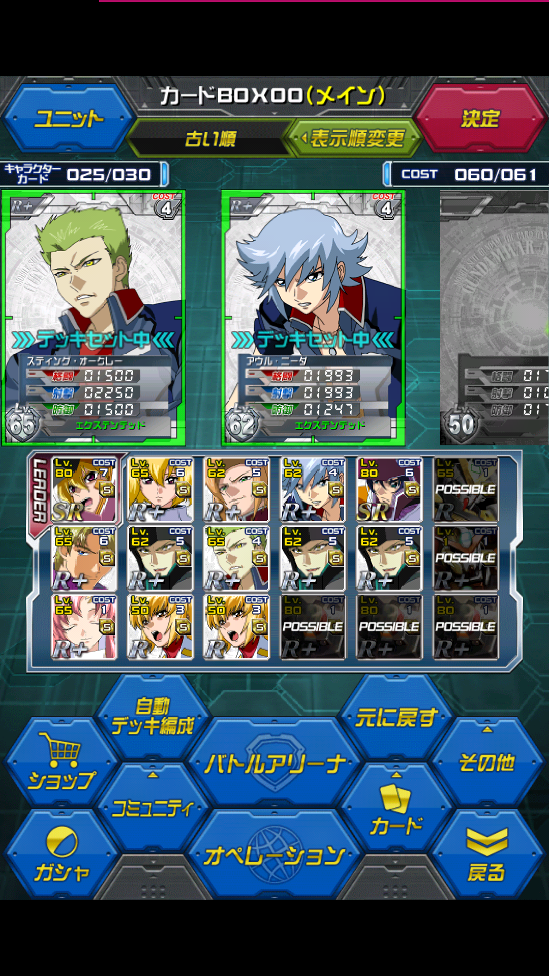 100万ダメージについて イベントの終了直前でやっと70万出せました えぇっ!70万ってどうやるの? と思う方もいますし と70万程度で喜んじゃってるの? と思う方もいるかと思います。 今回は前者の方のための「ACEキラーについて」の続き?になります。 さらにシークレットACEをソロ撃破するには計算をしてみようかと 長くなりそうなので興味のある方は 「つづきはこちら」からどうぞ 70万デッキはこちら カオスばかり引くんです・・・( ;∀;) 見てわかるように そこまで貴重なものは無いと思います。 むしろ今回のガシャ景品カードがメインです。 やはりACEキラーは偉大でカオス(笑)と言ってもこのイベント中だけは 射撃2万をパイロット抜きで超えてくれますし 防御も14000とSR+デストロイより遥かに使える機体です。 そのため私のデッキは1例ですが SR以上のユニットを拾ったらデッキに入れる! これがオーバーキルイベントのコツでは無いでしょうか で、100万ダメージをするための計算です。 100万与えるには 【自分の戦力】-【相手の戦力】=100万 が必要になります。 ここで相手の戦力を計算してみましょう ◆相手の出してくるカード LR ストライクフリーダム SR+ アカツキ(シラヌイ) R+ ムラサメ × 7 恐らくこんなパターンかと たまにアカツキが出てこないこともありますが ほとんど無いので除外します で、実際の戦闘からで計算 ストフリ&アカツキ&ムラサメ=40000 ムラサメ×3=10000 ムラサメ×3=10000 合計60000(敵の配置で多少増減します) 大雑把に相手の戦力は6万なので こちらは106万の戦力が必要になります 「無理だろ…」と思いますが 意外とLR抜きでも達成できる数字だったりします。 106万の戦力が必要なので カード1枚に付き11万8000が出せることが条件です。 11万8000、3倍を考慮すると 単体で39400出せるカードを毎ターン3枚づつ出せれば 100万超えると言う事です 「そんなのLRしかいねぇ」と思うかもしれませんが ここで登場するのがACEキラーです。 ※14:20更新 なぜかACEキラーLv4の数値を14000で計算していました。。。 LRデストロイ(3ターン目) 20800/20800/6000 →ACEキラー(Lv4) 36800/36800/22000 →怖いものステラin 42687/42687/24500 →白補正 43687/43687/23500 LRレジェンド 0/19575/18225 →ACEキラー(Lv4) 16000/35575/34225 →裏切り者レイin 17000/42100/40750 →白補正 19000/43100/41750 LRインフィニットジャスティス 13650/10400/13650 →ACEキラー(Lv4) 29650/26400/29650 →SRシンin 36825/26400/25975 →白補正 37825/27400/26975 ※1ターン目の格闘要員なのでアスランではなくシン なので 1ターン目はインジャ+レジェンド+レジェンド 2ターン目はレジェンド×3 3ターン目はデストロイ×3 これで計算上は 1ターン目 124025(敵パイロットあり) 2ターン目 125250(敵パイロットあり) 3ターン目 131061 となり3倍パンチで計1141008となり (恐らく)ダメージ108万となり達成です ・・・デッキコスト? デストロイ(10)×3 レジェンド(10)×5 インジャ(8)×1 穴埋め(1)×9 ユニットコスト…97 ステラ(7)×3 レイ(7)×5 シン(6)×1 パイロットコスト...62 うーん、Lv140台でカツカツといった感じでしょうか(;´∀`) そもそもこれだけ揃えれるのかも怪しいですが… 8万余裕はあるので防御にアカツキとかで代用が効くかもしれません 何が言いたいかというと ACEキラーは大切なんです! 以上! [0回]PR