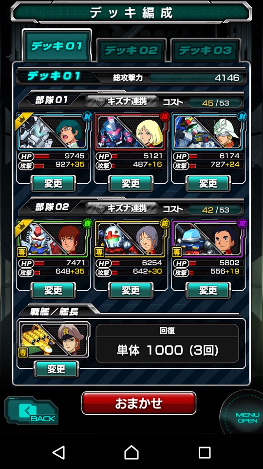 オルフェンズ、あとSガンロワ どうも、生きてます。 今まで定期的に更新してましたが 一度途絶えるとなかなか復帰しづらいですね(-_-;) 仕事が忙しいとか言い訳はあるんですけど ネタもそんなになかったり… はたまたTwitterも始めたことにより 些細な事ならアッチでいいやと思ってしまったり。。。 そんな事ではブックマークに登録してくれている方に申し訳ないので 最近のガンダムネタでも ○鉄血のオルフェンズ 新ガンダム始まりましたね なんか00とグレンラガンを足して2で割ったような、そんな感じです。 主人公がなんの躊躇いもなく人を殺していくシーンは 刹那やヒイロを思い出させるのですが 今見てる感じ「俺はもう…殺さなくて済む…」なんてシーンが出ません。 ガンダムでは珍しく むしろ最後死ぬんじゃないかとか。。。 兄貴分のオルガが死んでからが見ものですね(ぉ ○スーパーガンダムロワイヤル 始まりました新ソシャゲ よくGCBと比較されていた事は覚えているのですが 初代は全くやったことがありませんでした。 とりあえず始めています。 片手で遊べてオートも選べるところが素敵なので ちょこちょこ触って現在RANK9です 自然消化すらままならない感じですが 一緒にやってみる方はID「2552357」をよろしくお願いします。 ・・・何も貰えませんよ?(笑) ちなみに今のデッキ 最初のガシャで☆4ユニコーンが当たったのは行幸なんでしょうね 後は事前登録キャンペーンのスーパーガンダム ガシャ?11連が溜まるまで引きませんよ? [4回]PR