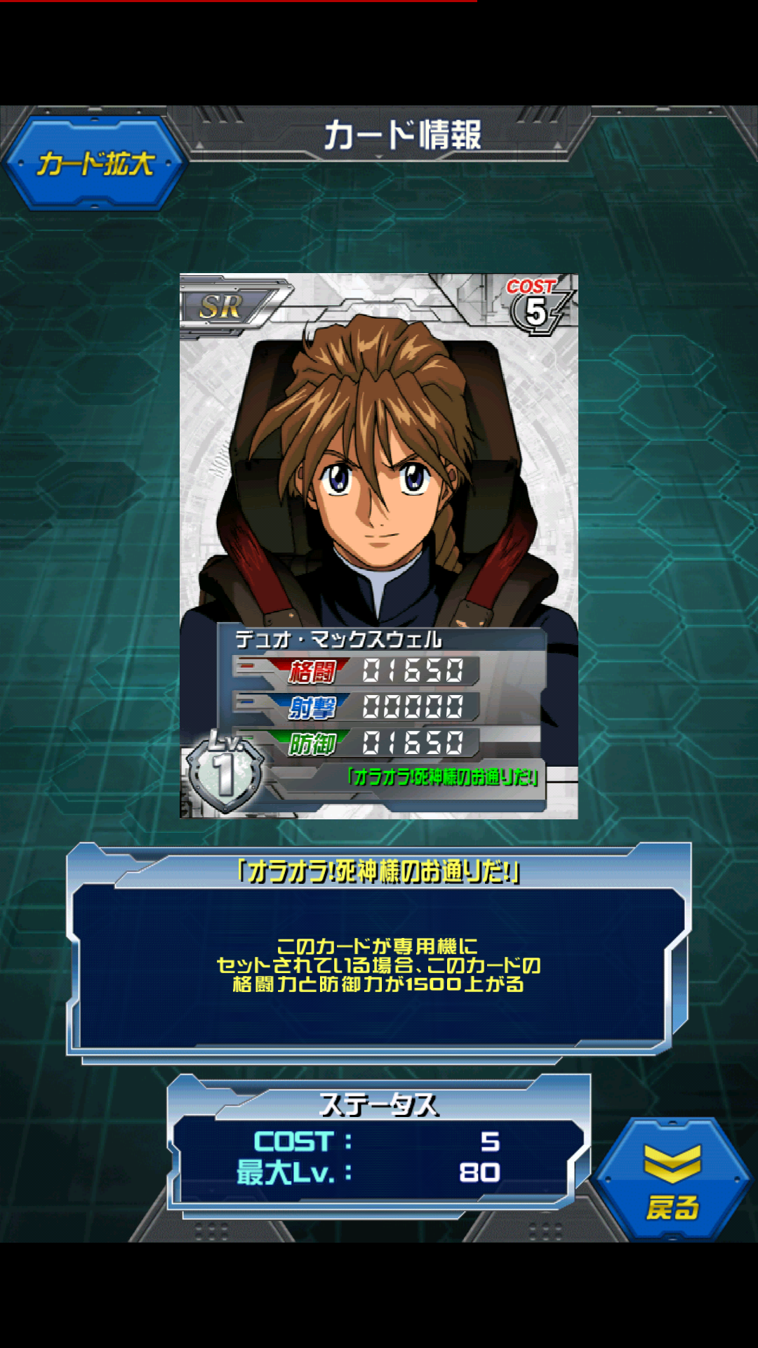 デュオ・マックスウェル ガンダム5機確認イベントにて赤箱からドロップ MAX値は3000/0/3000 専用機セットで4500/0/4500 まさにデスサイズに乗せろと言わんばかりの射撃0 専用機でスキルが発動するところは最大の利点 ACE戦でもアリーナ戦でも活躍できる凄い奴 一応ウイングゼロでもスキルは発動しますが 乗せる人はいないでしょう・・・ ふと思ったのは 同じSRコスト5 復活シャアは ステータスは同様の3000/0/3000 ただしスキルは「緑」セットで60%アップのため4800/0/4800 シャアに関しては青の百式、赤のサザビーと多色に渡っているため 専用機よりも色縛りにすることでステータスを上げているのでしょうね [0回]PR