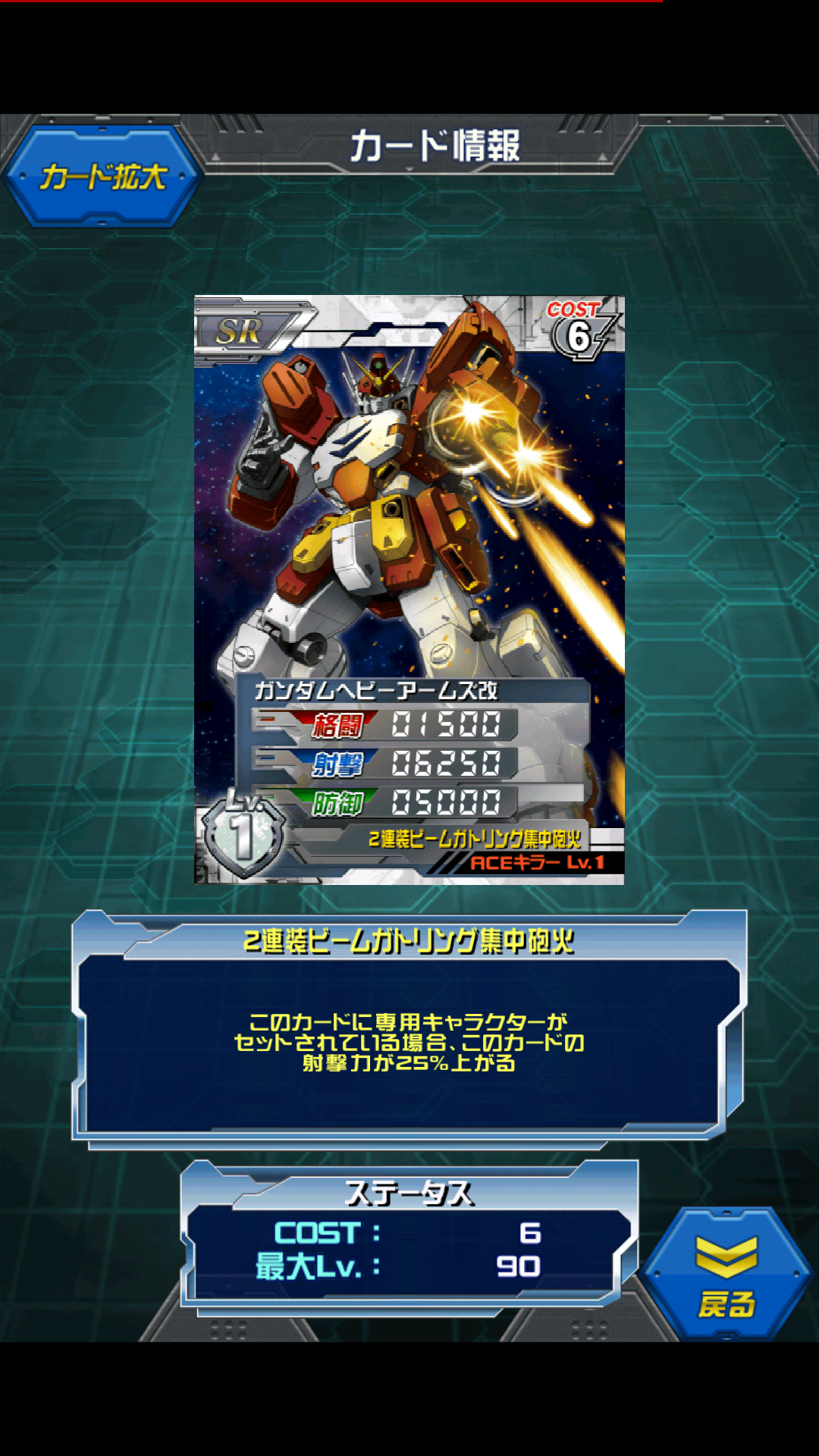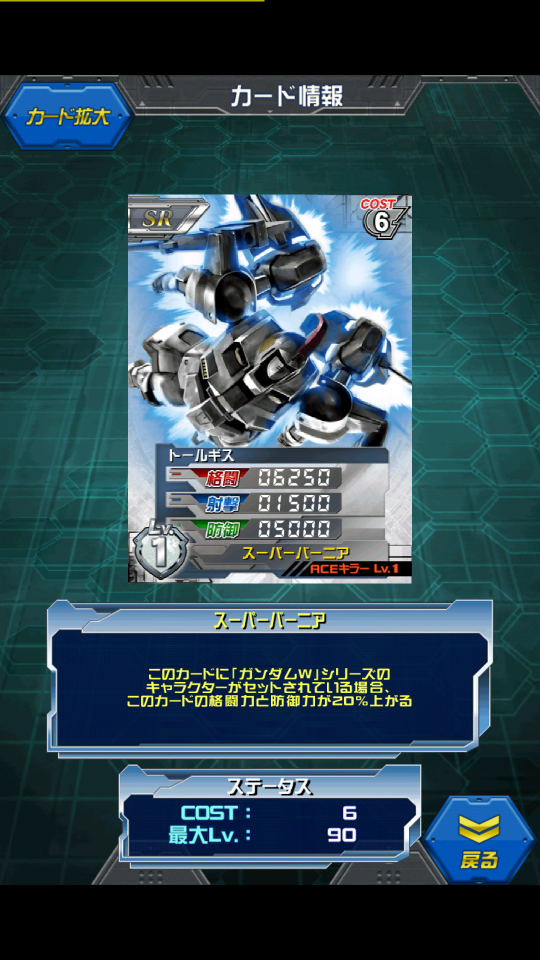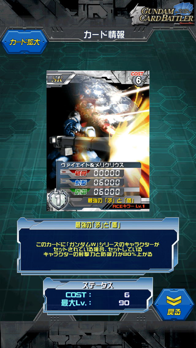 ヴァイエイト&メリクリウス ガンダムW ACEイベント 静かなる軌道のACEドロップ なぜか運がよく初日で既に3枚持っていたりする MAX値は0/8600/8600 なんか中途半端な・・・★3なら10000になるのかな? 専用パイロットはヒイロでもトロワでもお好きなほうをどうぞ 乗ったパイロットの射撃防御が80%上がるため 0/3000/3000を乗せたとすると 0/11000/11000+パイロットのステータス SR+ コスト8デストロイが 0/13000/13000なのを考えるとコスト相応な気がしますね 最強の攻撃力を目指したヴァイエイトと 最強の防御力を目指したメリクリウス 正直そこまで活躍した記憶はありません カトルのウイングゼロの当て馬にしか・・・ [0回]