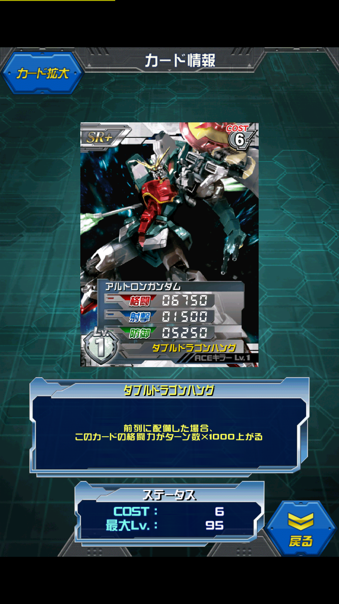 アルトロンガンダム シェンロンガンダム+ドラゴンガンダムの開発ユニット なぜか同時期の他W開発機はSRなのにコイツだけSR+扱い 失礼しました。デスサイズヘルもSR+でした 期待したMAX値は9500/2000/7500 3ターン目で12500/2000/7500 コスト6の格闘機としては高めのユニット しかしコストを1上げればガンダムグリープやデスティニーと 格闘値も高く防御にも出れる機体があるのでイマイチ感が否めない 専用パイロットはもちろん五飛 彼自体とはもちろん相性がよい いっそのこと茶のコレンカプルのようにほぼ格闘オンリー機だったら 面白かったのに・・・ [0回]PR