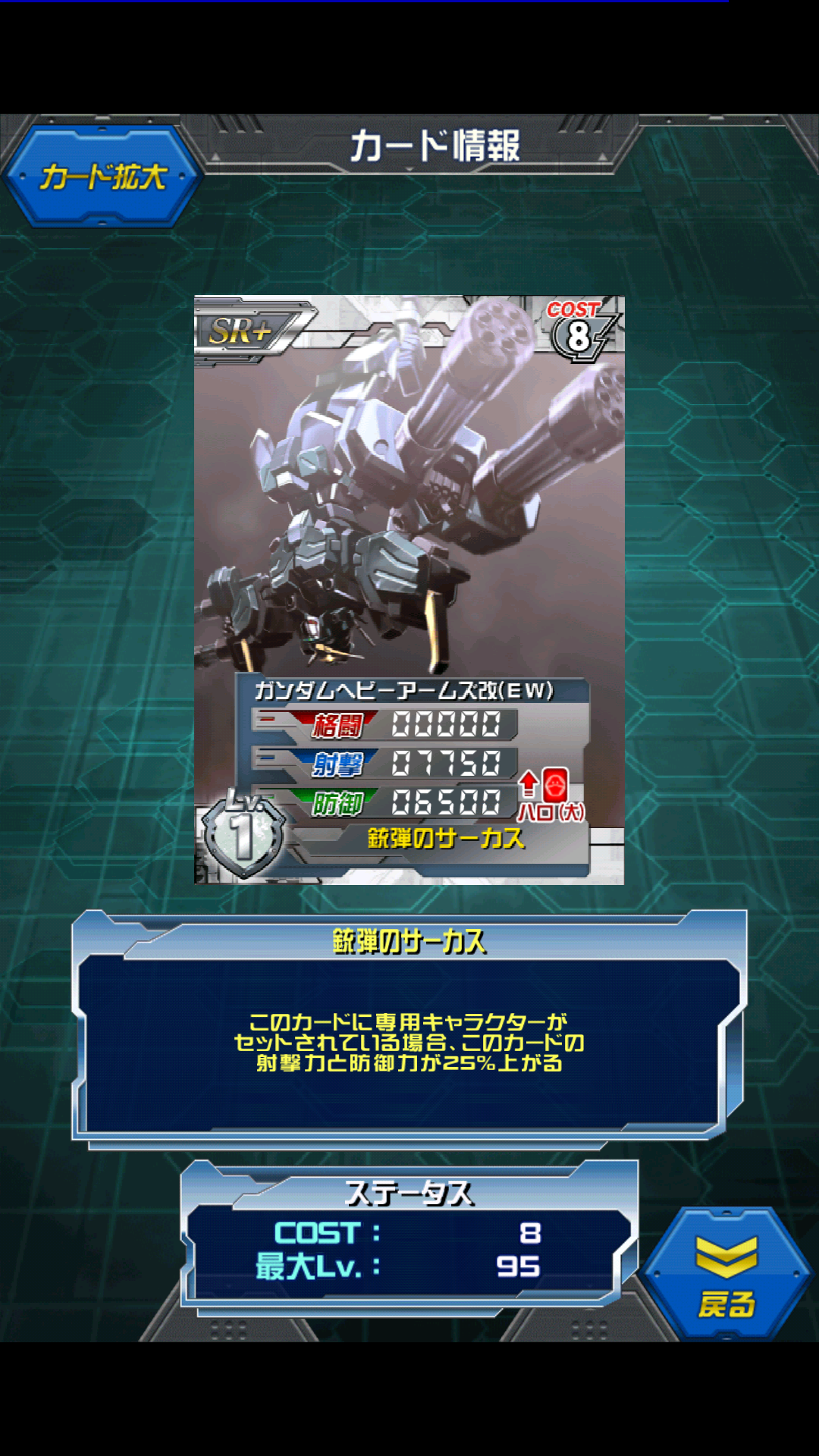 ガンダムヘビーアームズ改(EW) ガンダム5機確認の赤コンテナからのドロップ トロワの愛機でございます。 ヒイロは乗れません。。。 MAX値は0/11000/9500 スキルは専用キャラ、つまりトロワを乗せれば発動して 0/13750/11400 射撃だけでなく防御にも出れるようになっています。 ただ残念ながら今回のSRトロワが敗北スキル 惜しいなぁ・・・ EW時は顔に仮面を付けてピエロのような風貌が特徴 あのマスクはトロワの希望なのだろうか・・・? [0回]PR