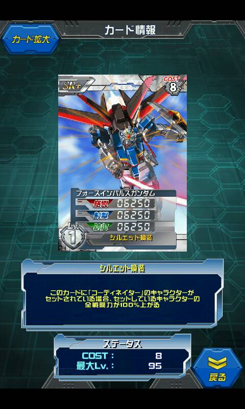 フォースインパルスガンダム 第一回バトルアリーナイベント1000P交換景品 フリーダムを落とした輝かしい実績を持つインパルスの万能型 MAX値は9000/9000/9000とド平均 スキルは乗せたコーディネーター分上がるというもの 専用パイロットはシン、ルナマリアぐらいかな? 現時点では今回のシンを乗せるぐらいしか使い道が無い 今回のシンを乗せると12500/9000/11750となりシンのステータスも加えると 20150/10000/12350と格闘特化機として見れば2万超えるのはおいしい 前のR+怒りシンを乗せると9000+2250+2250+1000+(ターン数×800) 3ターン目でALL16900 ・・・うーん、コスト8/6使っての数字じゃないね 今後シン&ルナマリア等の高コストのコンビカードが出てくると このカードも面白くなりそうです 困ったときはフォースで出撃するのはストライク時代からの風習 シンがデスティニーを与えられた後はルナマリアが後を引き継ぐことになりました フォースでもエクスカリバーを使った時はまだしも レジェンドに貸した瞬間に「ソードインパルスいらないよね」と思ってしまいました 一応フォース、ソード、ブラストで機体の色が変わるのは 機体の装甲の電圧により防御力の差があるとかなんとか 決して色違いのプラモを売るためだとかそういうことでは・・・ [0回]PR