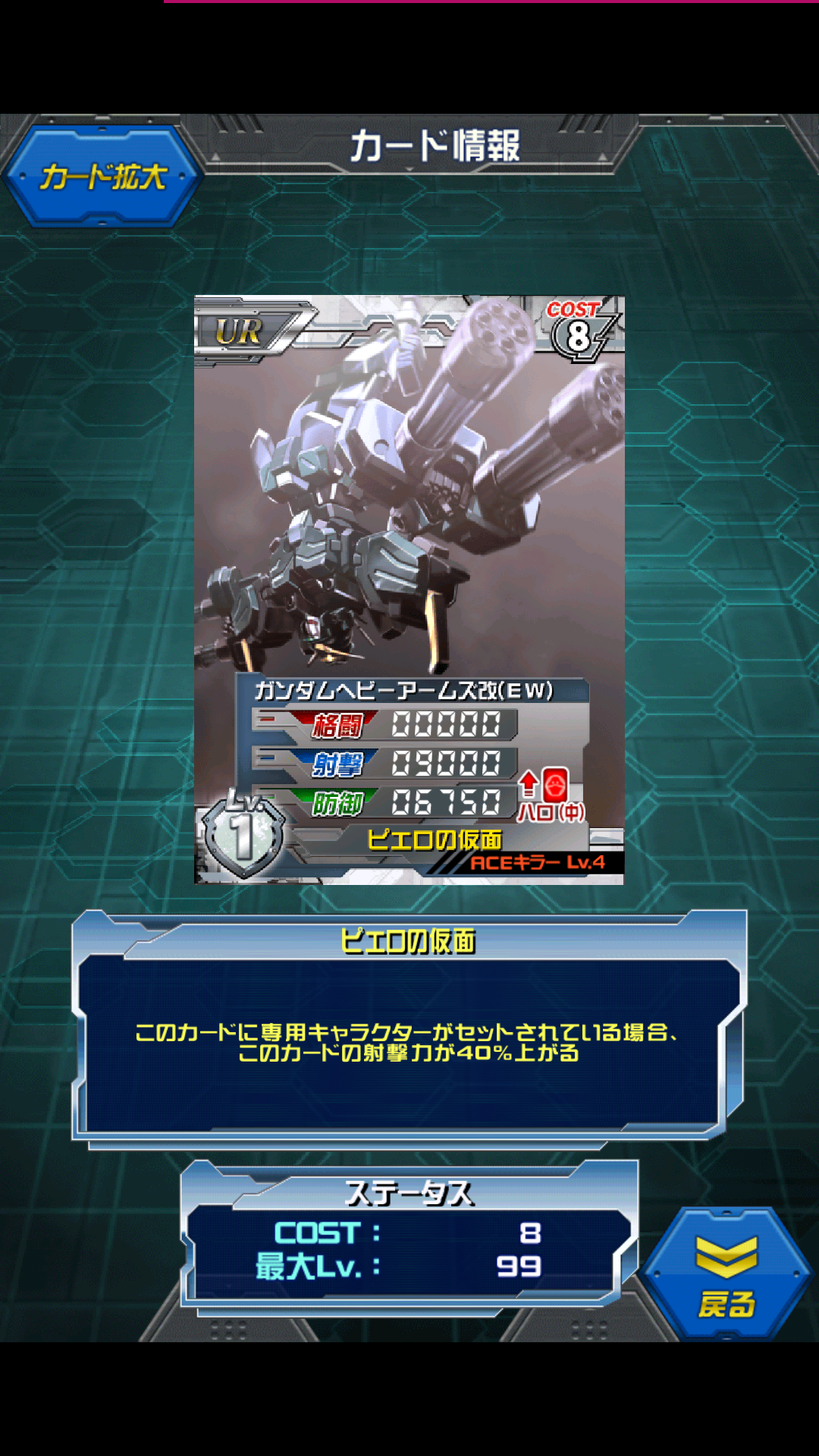 ガンダムヘビーアームズ改(EW) ガンダムヘビーアームズ改(EW)+ドクトルSの研究データ ロボットとは思えないサーカスジャンプが特技 MAX値は0/13000/9500 スキルは開発前は射撃防御でしたが射撃のみ上昇に変化しており トロワを乗せれば0/18200/9500 W勢は中途半端だのビルゴしか使えないだの 散々な言われ方をしていましたが中途半端な防御を捨て去り 射撃に特化したカードになりました。 適正はトロワしか居ませんが元の数値が高いので どのトロワを乗せても射撃2万オーバーを叩き出せます。 今回のSRトロワを乗せれば コスト8/6で1000/25150/12250と素敵な射撃値です。 劇場版に登場したヘビーアームズのEW版 高く回転しながら飛び上がり 着地と同時に両手のガトリングで一掃するのが戦闘スタイル EW時は「兵器のみ破壊する」ため弾に火薬を入れておらず サーペント部隊の関節部等を狙い機動停止させることを目的として戦闘を行った トロワの技量が窺えますね [2回]PR