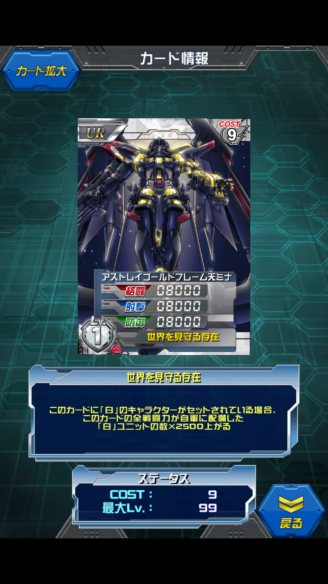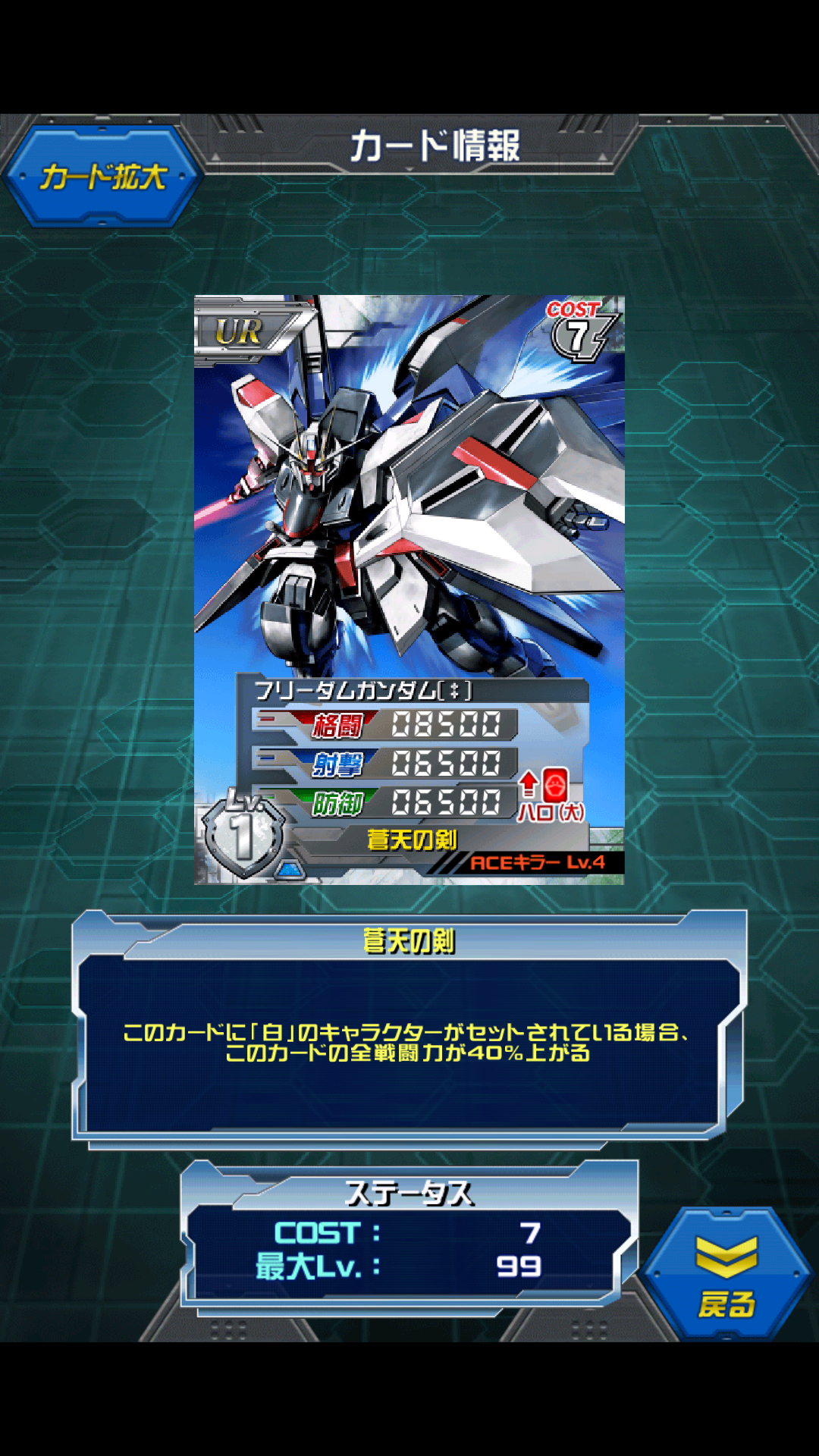 フリーダムガンダム 2週連続開発イベント グレードアップカード。 8枚のエールストライクから開発されるザフト製MS 白/青のマルチカラー MAX値は12000/9250/9250 白キャラセットで16800/12950/12950 フリーダムにはあまり似合いませんが格闘寄り万能ユニット。 キラを乗せずとも白キャラでOKなので使い勝手良し。 ステータスもコスト7にしては普通に高いので 白デッキはもちろん 格闘が弱い青デッキに入れてしまうのもアリだと思います。 ザフトから盗み出したMS。 ニュートロンジャマーキャンセラーと呼ばれる機能?装置?を装備しており 核分裂を抑制するニュートロンジャマーを抑制する… 要は無尽蔵のエネルギーを持っていると言う事です(;^ω^) あんまり知らなかったのですが 搭載MSかなりあるんですね… [1回]PR