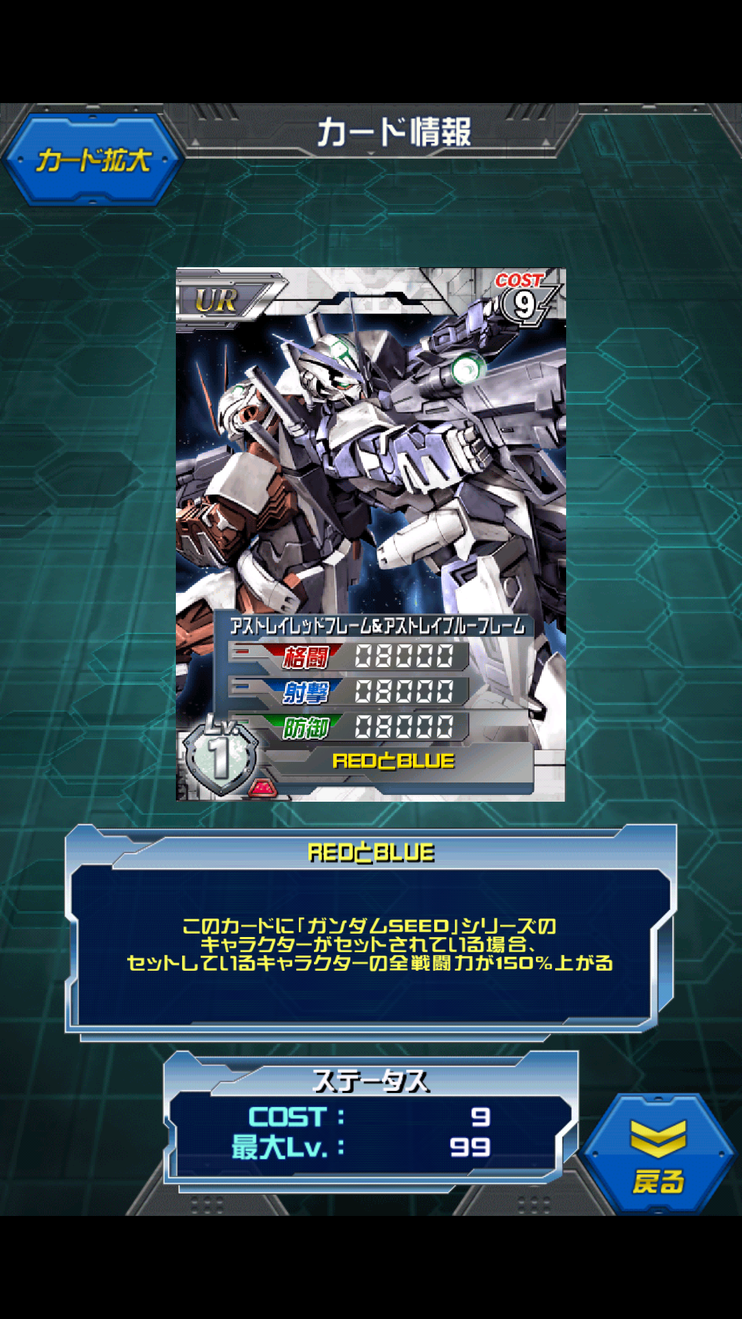 アストレイレッドフレーム&アストレイブルーフレーム 2014年末SEED中隊戦イベントガシャ景品 アストレイの赤と青。 白/赤のマルチカラー MAX値はALL11500 ロウ&劾同様にセットしているキャラの戦闘力150%上昇する。 ロウ&劾をセットすれば+4500 専用機補正含めた合計値はALL22530 ド平均、かつキャラのステータスで能力が変わるので 専用機補正も考えればロウ&劾が一番いいかと。 ただ一つ問題があり 白単なら天ミナにセットするとALL24530 専用機補正が無くても天ミナに乗せるほうが数値が高いのが悲しい。 しかも同じコスト、同じマルチカラーと嫌がらせのように勝る部分が無い。 キャラの戦闘力150%なので ALL5000の劾かロウが出ればやっと勝てる…うーん… 初期のレッドフレームとブルーフレーム 劾&ロウだったのに青枠&赤枠の順番じゃないんですね …どうでもいいですが(;´∀`) 基本的にこの状態は特に特徴も無い色が違うだけのアストレイ。 ここから赤、青、さらに金と別々の道を歩むことになる… 個人的には青セカンドLのタクティカルアームズが好きです(*´▽`*) [2回]