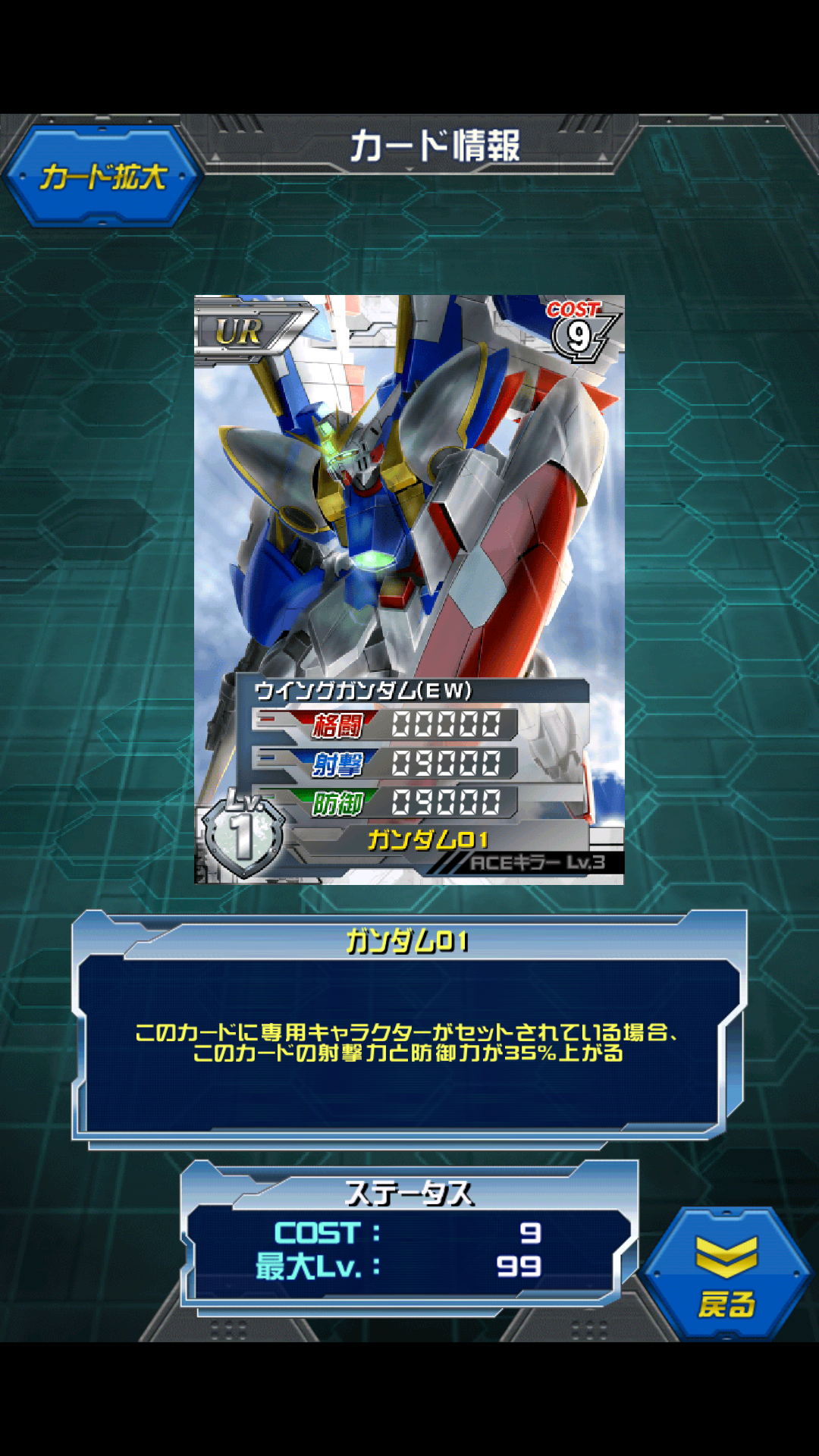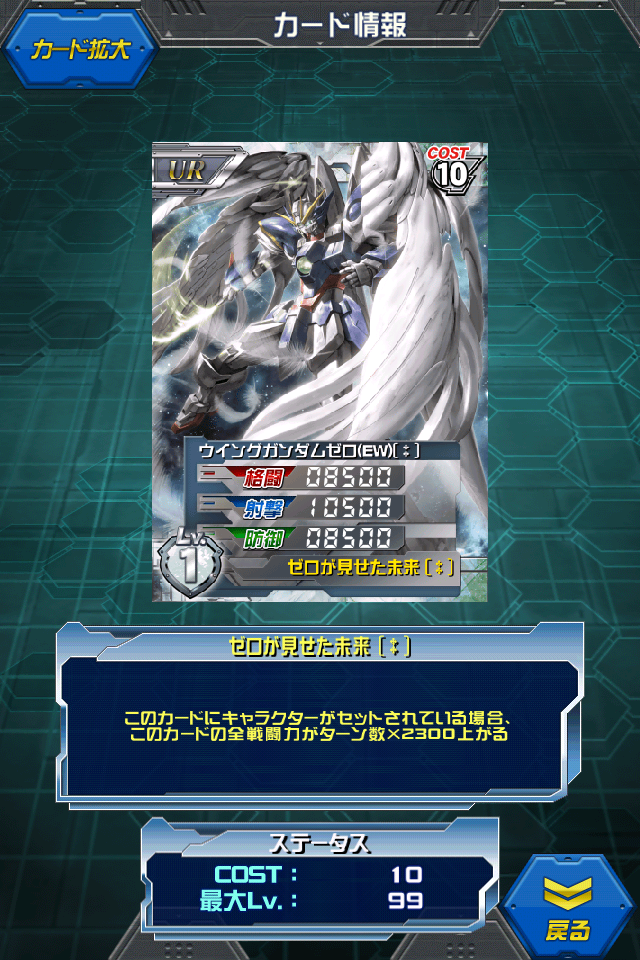 ウイングガンダムゼロ(EW)[ ‡ ] WingZさんからの提供カード >戦友のWingZです ブログ頑張ってください ありがとうございます …あれ?バレてる…?一応名前は隠してやっているのですが(;´・ω・) カンスト白Wの手本のようなデッキは明日辺りにでも使わせていただきます(*´▽`*) ついこの前の限界突破カード コストが7から10に上がりステータスは見違えるほど上昇 MAX値は12000/15250/12000 キャラセットでターン数×2300上昇するので 3ターン目なら18900/22150/18900 ビルゴ以下なんてもう言わせない! ほとんどトールギストーラスの上位互換 もちろん平均ながら高ステータスも特徴ですが 一番の特徴はスキル発動に専用パイロットがいらない所 ランキングヒイロでステータスの底上げを図るのもいいですが コスト1リリーナやレディが乗っても戦えるところは嬉しい点 URのWユニットは専用キャラを要求するのが多く キャラコスト調整が難しいですが誰でもいいのはW単には有難いスキル なぜか羽根(のような翼)を持つようになった劇場版ゼロ 飛ぶときに舞い散る羽根は演出だそうです。 羽根で機体を覆うことで防御形態を取ることができ スパロボではなぜかIフィールド扱いだったことも 最期はアルトロンとの戦闘、サーペント部隊の砲撃と色々とダメージを受けている中 ツインバスターライフルを放ち反動で大破する。 [2回]
