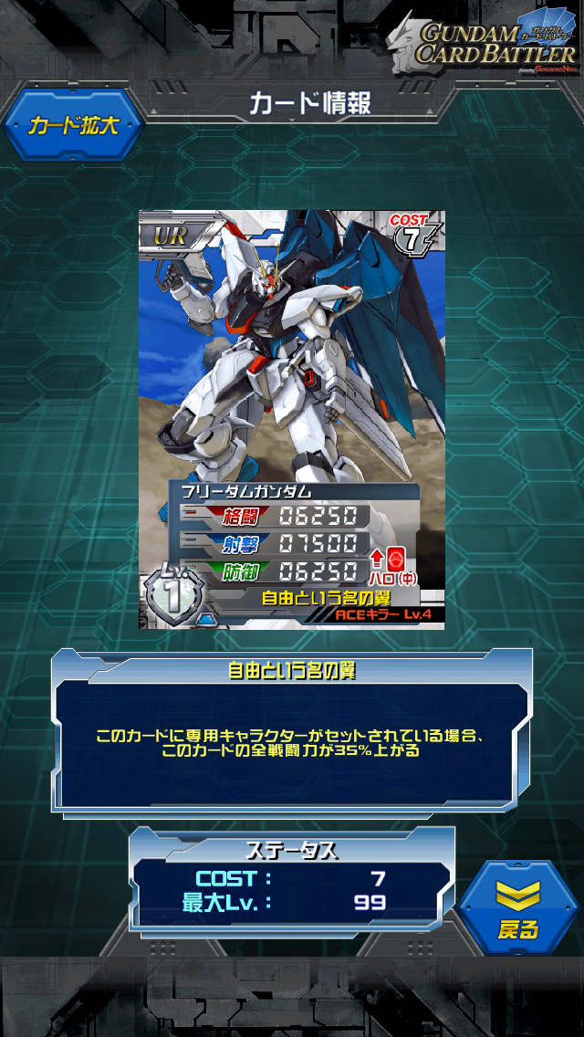 フリーダムガンダム 2014年末SEED中隊戦イベント ポイント交換景品 自由と略されるキラの愛機です。 マルチカラーで白/青 今更気づいたのですが今回のカードマルチカラーだらけになってますね… てっきりクロスオーバーのカードだけかと思ってました(;'∀') MAX値は9000/10500/9000 専用キャラセットで12150/14175/12150 射撃寄り平均値 事故防止に1枚入れておくのも悪くないカード。 逆に言うとこれだけ入れても勝てないので複数枚は必要ないかも。 キラを乗せてもいいですがキラが重たい場合は 今回のポイント交換報酬のカガリ辺りが良さそう。 ザフトが奪取したガンダムから作り上げたMS。 ジャスティスとは兄弟機。 ニュートロンジャマーキャンセラーを搭載した一応試作機扱い。 ほぼ無尽蔵のエネルギーのため撃ち放題な機体。 フリーダム登場シーンの第35話「舞い降りる剣」はカッコよかったです(*´▽`*) ただやはり…フルバーストで毎回戦闘シーンを終わらせていくのは如何なものかと [2回]