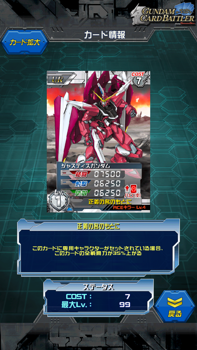 ジャスティスガンダム 2014年末SEED中隊戦 イベントポイント交換景品 アスランの愛機。正義の名を持つガンダムです。 白/青のマルチカラーユニット。 MAX値は10500/9000/9000 専用キャラセットで14175/12150/12150 フリーダムとは違い格闘寄り平均ユニット 専用キャラはアスラン…他にいるのかな? フリーダムもそうですが専用キャラを要求されるのはちょっと辛いですが コスト7の平均ユニットとして見れば優秀。 だけど積み過ぎるのもよくない、そんなカードです。 フリーダムとジャスティス合わせて使いたいですが 平均値ユニットを積むと安定は増すけど戦闘力は落ちる… この辺りは悩みどころですよね 一応両方白/青のマルチカラーなのでフリーダムとジャスティスで場に出せれば 色補正が白と青の二重にかかる…はずなので 白青デッキ、として作ってみるのもいいかもしれません。 アスランがフリーダム奪取の命令を受け授かった機体。 …なのにオーブにつくことになりザフトからしたらそりゃ裏切り者ですよね。 この頃はまだ武装は大人しく特徴的なのはリフターのファトゥム00 よくフリーダムとの連携でフルバーストしていますが ジャスティスにはそこまで砲門は無いので ビームライフル、リフター搭載のビーム砲とそこまでバーストしてない。 最期は自爆。Wみたいだ。 [2回]