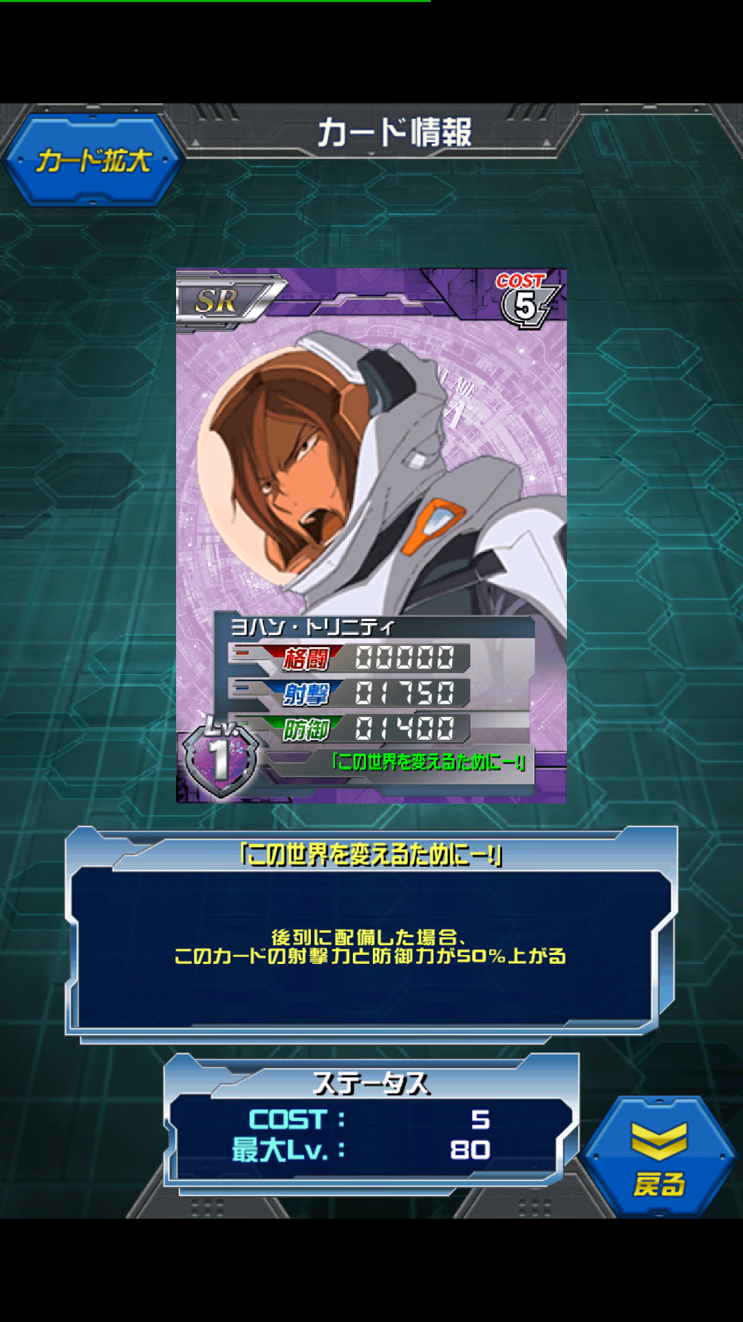 ヨハン・トリニティ 三軍合同軍事演習ガチャ景品 トリニティ兄妹の長男です。 MAX値は0/3250/2500 後列にいれば何に乗っていようと0/4825/3750になります。 専用機はスローネアイン 紫では貴重な射撃パイロットです。 兄妹の中でクールさが特徴で一番まともなヨハンさん 大物臭が漂っていましたが弟同様にサーシェスの当て馬にしか過ぎませんでした。 ニールとの射撃対決を期待していたんですが・・・ [0回]PR