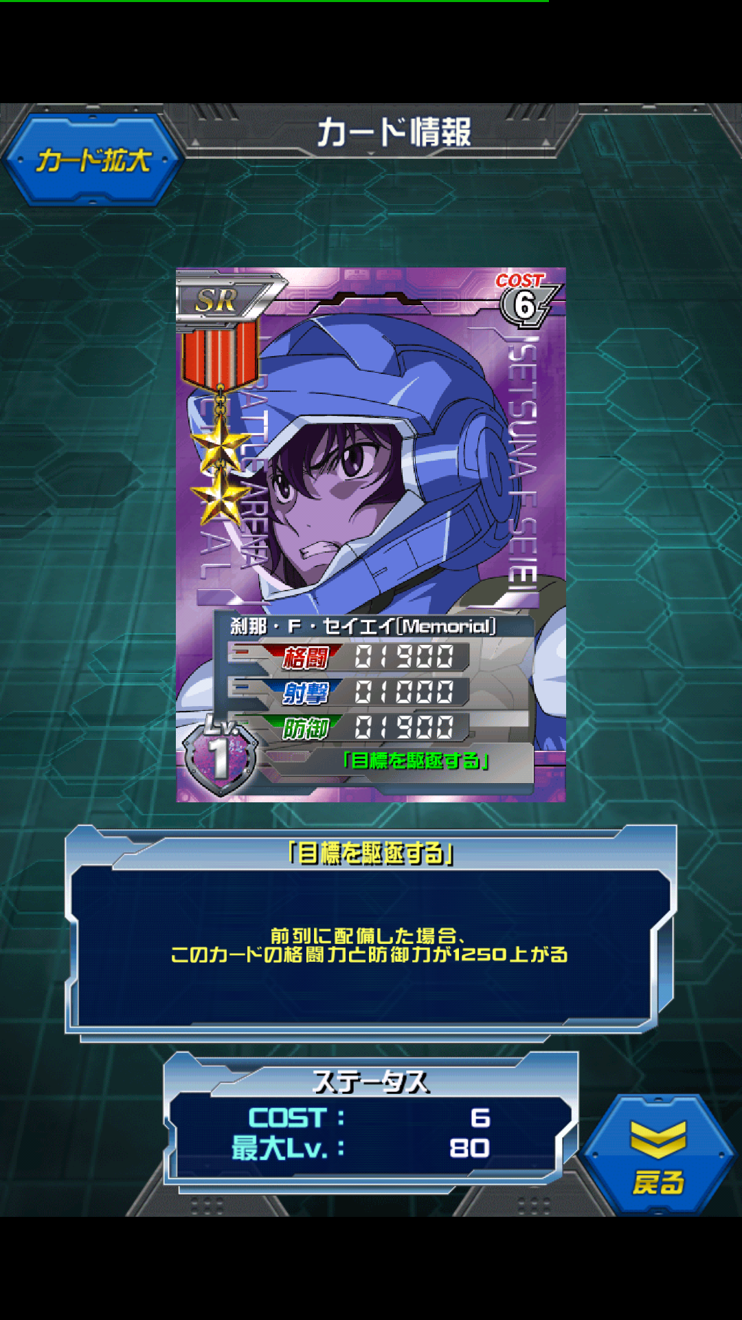 刹那・F・セイエイ(Memorial) 「刹那 メモリアル」で検索している人がいて ちょうど持っていたので期待に応えてみます 宇宙世紀vsアナザーのアリーナイベントのランキング報酬 これは★2になりアナザーは勝ち組だったので101位~300位の報酬(だったかな? MAX値は3250/1750/3250 専用機セットで4500/1750/4500 多色デッキなら活躍の場があるが紫デッキには虹刹那がいるため出番がない コストを2も上げてステータスが低いというのは… 逆に言えば多色なら活躍の場はあるということ 「キャラコストが1足りないから純正刹那が入らない!」 という時にはうってつけだと思います 取っておいて何ですがメモリアルの中では残念な部類 敗北スキルのハマーンよりはマシかもしれませんが。。。 [0回]PR