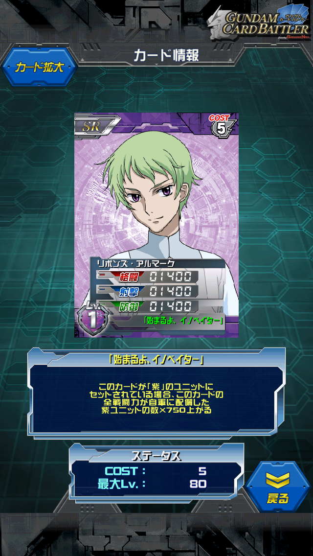 リボンズ・アルマーク 三軍合同軍事演習ガチャ500回報酬 世界の救世主・・・ではなく紫の救世主 MAX値は2500/2500/2500 紫単なら4750/4750/4750とコスト5では圧倒的なパフォーマンスで アムロもびっくり 専用機は今のところOガンダム一択 R、R+のOガンダムは論外なので今回のSR+Oガンダムに是非乗せたいところ Oガンダムとの組み合わせではまさに「救世主」となりうるステータスに 機体の新人声優「蒼月昇」がCVを務めるダブルオーのラスボス 最初は秘書的な位置付けだったが 「あんな小物にラスボスを任せておけない」ということで1stシーズン終了と同時に ラスボスの地位を手に入れた 刹那が憧れたOガンダムに乗っていたのがリボンズ ラストは1stガンダムOガンダムvsエクシアという熱い展開で締めくくられる [1回]