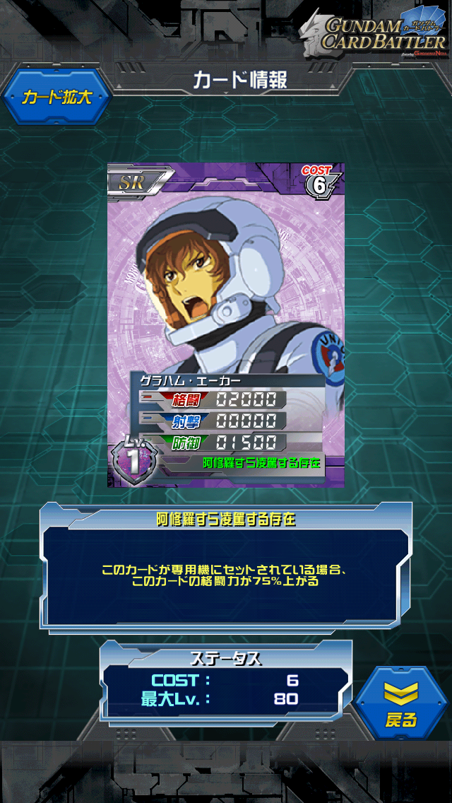 グラハム・エーカー 三軍合同軍事演習後半のシークレットACEランキング報酬 刹那とは別の意味でガンダムを愛している男です MAX値は★無しで3500/0/2750 専用機セットで格闘は6125になります セットするだけで格闘6000超えるのは大きな強み 格闘だけ上がるところからURフラッグに乗せるために用意されたカード 刹那の時代は終わりだと言わんばかりの格闘特化 URフラッグを持っている人はこのカードは必須だと思います この頃はまだ純粋にライバルであるガンダムを追いかけていた…気がする 「この気持ち、まさしく愛!」のセリフが印象的すぎる 対ガンダムのオーバーフラッグス隊の隊長 それを考慮してかNPCとしてのデッキ構成は18枚中17枚がオーバーフラッグという 原作再現にちょっとクスリとしてしまいました [0回]