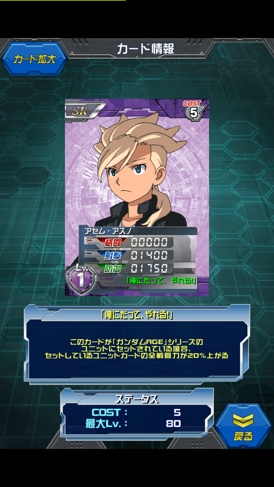 アセム・アスノ 第一回バトルアリーナイベント350P交換景品 AGE2期の主人公です。 MAX値は0/2500/3250 役目も防御型とアレルヤと役目はほぼ一緒 果たして取りに行く必要があるのか?と聞かれるとウーン、としか いずれ役に立つ、かもしれませんが今すぐ活躍の場は無いかと ただ今回のイベントで勲章を使うなら話は別 アレルヤキュリオスよりも数値は高くなるので 刹那を使わない紫デッキにはいいのではないかと 2期では好青年 3期ではグレて宇宙海賊をやってました AGE版ニュータイプとも言えるXラウンダーの適正が無かったが 「お前はお前自身になりな」(違 とスーパーパイロットを目指すようになる。 スーパーパイロットって何ですか・・・?整備もできる、とか? [0回]