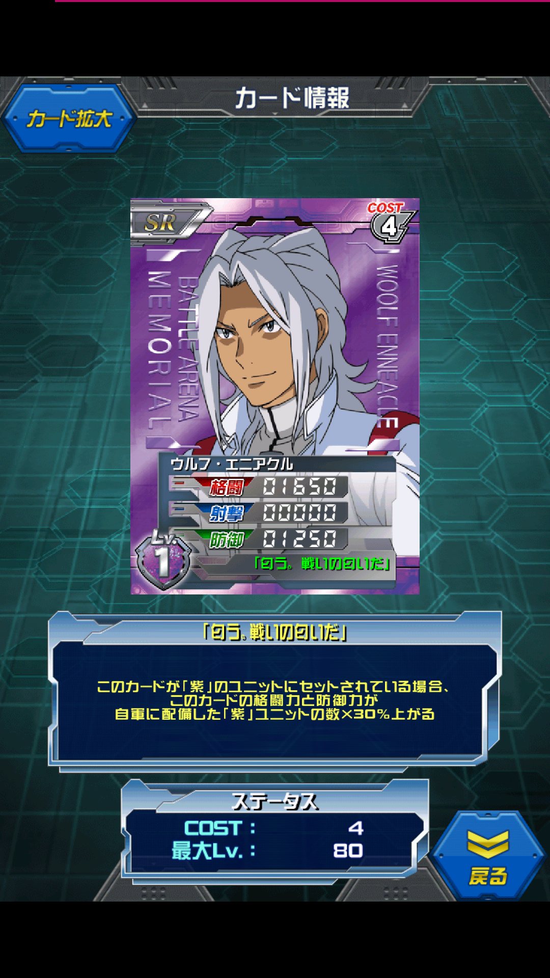 ウルフ・エニアクル 第2回バトルアリーナ 350P交換景品 白いMSが大好きな隊長です MAX値は3000/0/2250 自軍の紫×30%格闘と防御が上昇するので 最大90%上昇となり5700/0/4275 コスト4としては破格の性能...と言いたいところですが 紫には虹サイン刹那がいるので多少被ってるんですよね… 00縛りではなく紫縛りのため多少緩いのですが現時点は紫=00なので そこまで気にならなかったり 彼が射撃タイプだったなら紫でかなり使えるカードになったのですが、惜しい 今後彼の専用機が増える可能性も低いので...AGEイベントが出ることに期待 フリット編、アセム編と2編に渡り登場したウルフさん 白に拘りがあるらしく機体は白で統一されている その意思をアセムも受け継いだのか白いAGE-2に乗る ...はずだったのだがキオ編では黒に塗りつぶされていたり… [0回]PR