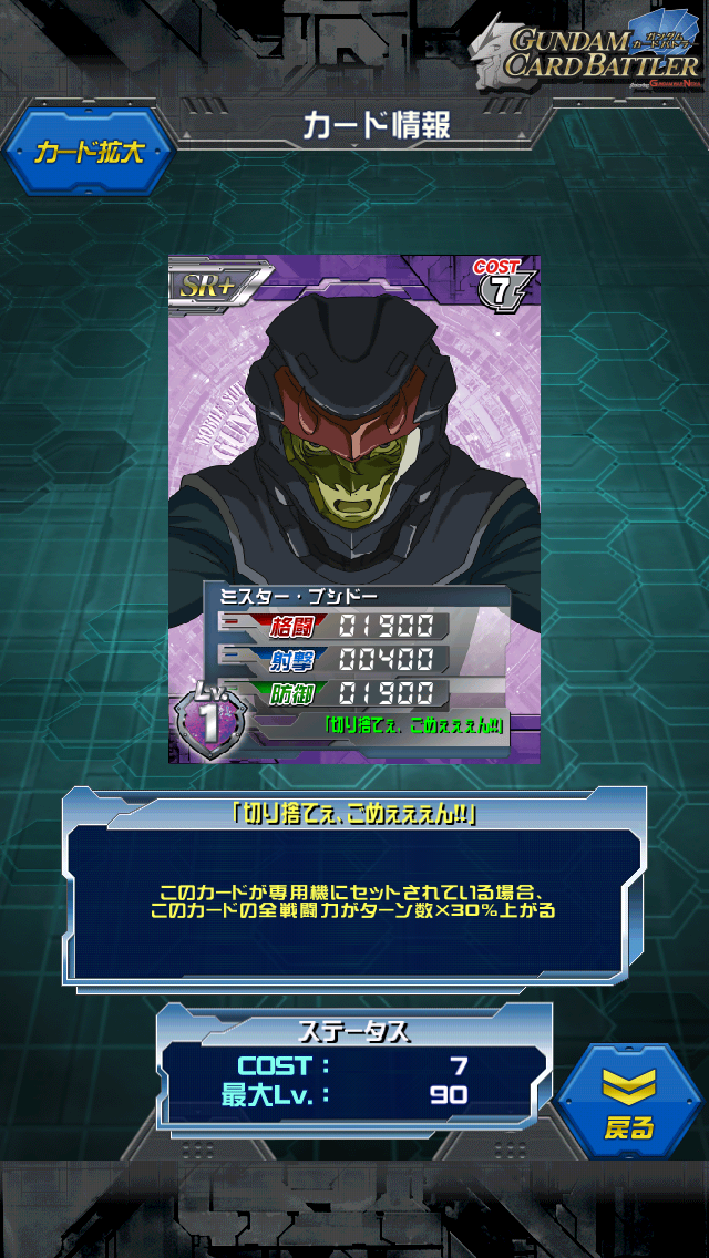 ミスター・ブシドー 仮面奉納イベントVer2の報酬カード 武士道を学び本来の名を捨てたグラハムさん MAX値は3500/750/3500 スキルはターン数×30%上昇なので 1ターン目:4550/975/4550 2ターン目:5600/1200/5600 3ターン目:6650/1425/6650 キャラクター的に格闘に目が行きがちだが 格闘と同じ数値を持つ防御にも注目したい 今回のトランザムマスラオに乗せればマスラオ自体は15350/3825/15350 ブシドーセットすることで1ターン目から2万超え 3ターン目に至っては23000という素敵な格闘防御になる キャラコストに7取られるのは苦しいかもしれないが ド平均コスト7には無い爆発力を持っているので マスラオとセットで使いたいところ スサノオでは防御が勿体ないのでランキンググラハムに軍配が上がるかと ワンマンアーミーを理由にひたすらガンダムを狙い続ける武士 指揮官の命令に従わないこともしばしば ただ数少ないガンダムと対等に戦えるパイロットなので リボンズにも一目置かれる存在 ミスターブシドーと言う名は自分で名乗った訳では無く 周りから言われているようで多少迷惑してるとか パイロットスーツの時と日常では仮面のデザインが違ったりする 口部分が邪魔なのかね [2回]