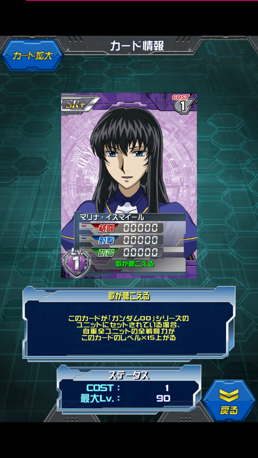 マリナ・イスマイール 仮面奉納ver2イベント 撃墜数350報酬 00のヒロイン…?にしては出番は少ないかも MAX値は変わらず0 00シリーズに乗せれば最大4050/4050/4050 紫=00みたいなものなのでこの手のカードの中では 一番使いやすいかと 専用機はダブルオー、ダブルオーライザー エクシアにも乗った気がするんですがダメでした。 色単が優遇されてきたため劣化イオリアと見てしまいますが それでもコスト1なので使い道は色々あります。 専用パイロットが必要なユニット、又は パイロットのステータスに影響するスキルを持ったユニット には乗せないようにご注意を 戦争で平和を得ることはできない、と思うお姫様 戦うことしかできない刹那の事を気遣うヒロインポジション 恋人、とはちょっと違うお互いを想い合う関係 SEEDのキラ&ラクスではなく Wのヒイロ&リリーナの関係に似ていますね [1回]