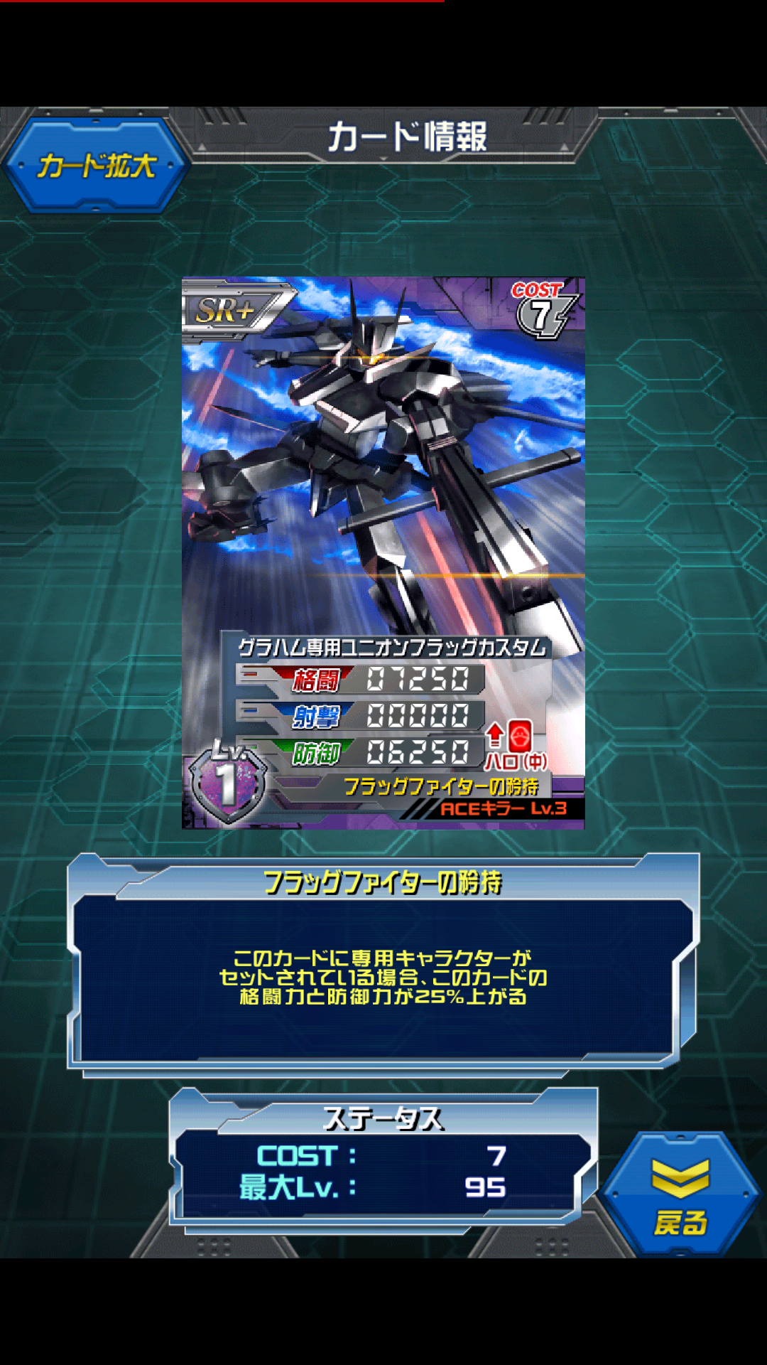 グラハム専用ユニオンフラッグカスタム 三軍合同軍事演習ガチャ景品 その名の通りグラハム専用のフラッグです MAX値は10500/0/9000 専用キャラのグラハム、又はブシドーセットで13750/0/11250 どこかの格闘しかできない脳筋とは違います。 セブンソードよりも格闘が600ほど落ちますが防御は3000ほど高いです。 コスト7に何を求めるか、ですが安定性という意味では こちらのほうが使いやすいかと わずか一週間で完成させたという絶対に乗りたくない機体 ガンダムに対抗すべく高機動化を図ったため荷重のGがかかる、まるでトールギスだ グラハム専用、とあるがそもそもユニオンフラッグカスタム自体がグラハム専用の記憶 グラハムの癖などに合わせているため武器が左利きで逆だとか 色が違うだけじゃないんですよ! [0回]PR