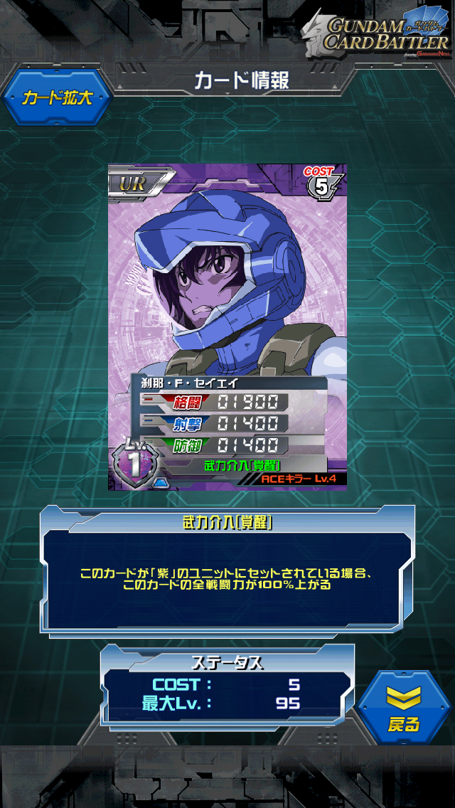 刹那・F・セイエイ 00もジオングも出ません。 そりゃそうだよね… 部隊メンバーからは2人ジオング報告がありました。 うらやましい… と言うわけで覚醒刹那です。 シャアはイラスト変わったのに… 紫/緑のマルチカラー MAX値は3500/2500/2500 紫ユニットセットで7000/5000/5000 覚醒シャア同様にコスト5と軽いURキャラ。 格闘が高めなのは刹那に合っていて嬉しい。 コスト4刹那に頼っていた方は乗せ換えの時期かもしれませんね。 あちらもあちらで00単には有効なのですが マルチカラーが出てきたため00単に拘ると難しいかもしれませんし… 基本的に刹那の専用機自体格闘寄りが多いので 組み合わせで困ることはないかも。 相変わらずサブカラーの使用用途は不明。 緑/紫のユニットに乗れることが言いたいのでしょうが… 俺がガンダムで一躍有名になった00の主人公。 ガンダムになりたい、それだけ聞くと危ない人ですが 刹那にとってのガンダムがどういう意味を持つのか、が分かると 自然とそのセリフも意味が分かってくる。 00→00 2nd→劇場版と一番成長する人。性格も身長も。 [4回]