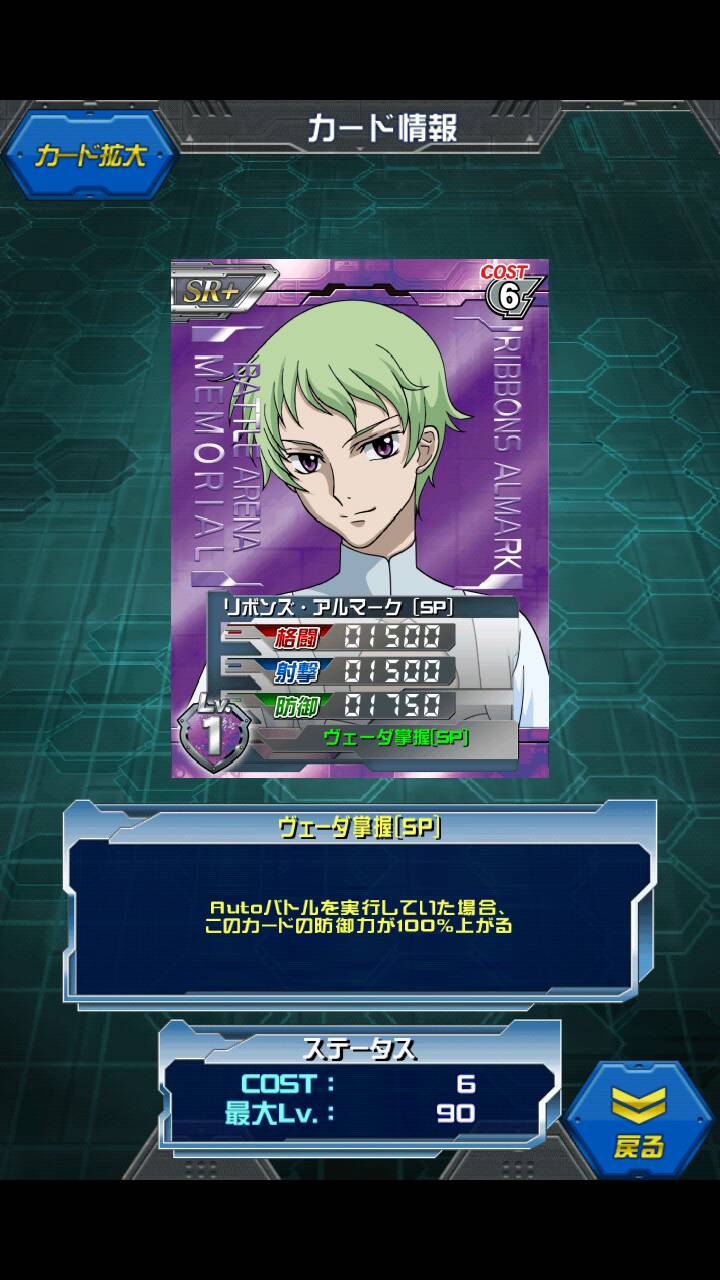 リボンズ・アルマーク 名無しさんからの提供カード 画像はSR+の物です。そこはご愛嬌 MAX値は3000/3000/3500 オートなら防御力が150%アップなので8750になります。 防御特化な救世主。 今回のクセあるキャラ達の中では分かりやすいスキル。 が、オートスキルは敗北スキルの次ぐらいに死にかけているスキルなので 人のプレイスタイルに左右されるカード。 オートでいつもプレイする人にとってはノーリスク オートなんて雑魚ACE戦ぐらい、なら全く必要はないかと。 しかも防御しか上がらないところもなんだかなぁ…というところ。 中にはオートでうまく戦えるようにデッキを工夫する方もいたりします。 そんな方はレベルをMAXまで上げなかったりして微調整するとか… もう今のインフレではいないと思いますが(;^ω^) 1stシーズンでは裏方役 2ndシーズンではラスボスとして君臨。 声は聞いた瞬間に分かってしまうあの方。 自分の名前をガンダムに付ける変わり者。 刹那の「俺がガンダムだ」に対抗してるのかしら。 それにしてもリボーンズガンダムはまだガンダムウォーにないのかしら このままリボンズはOガンダムで終わってしまうのだろうか… [3回]