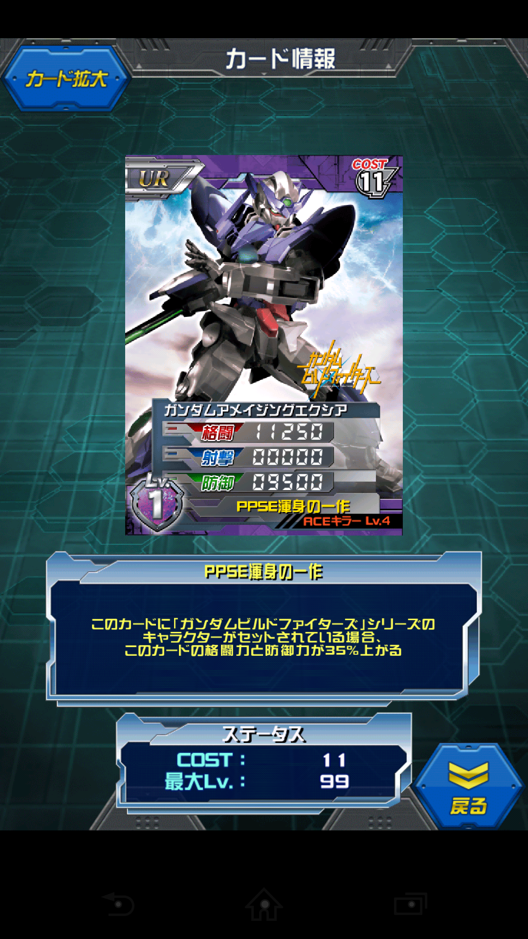 ガンダムアメイジングエクシア ガシャを今回引いていない私へのzeroさんからの提供カード 初のコスト11…かな、さらに出た瞬間から限界突破対象 …初めから突破機体くれたらいいのに… MAX値は16000/0/13500 ビルドファイターズキャラセットで21600/0/18225 限界突破後には MAX値は17500/0/14750 スキル発動で24500/0/20650 格闘防御特化機体 コスト11だけあってパイロット乗らずとも2万オーバーなユニット。 LRが手に入りやすくなった(なる?)時代では コスト11という高コストが仇になってしまうかもしれません。 スキル発動条件が紫キャラだったらなぁ…と思うところ。 ビルドバーニングのせいで居場所が難しいですね(;^ω^) メイジンの扱うビルドファイターズでの最終機体。 決勝戦に間に合って作られたPPSE社の傑作 ・・・だったのだがどこぞの会長に改造を施され完全な悪役機体になってしまったり。 エクシアのシンプルさを失わないように改造されており もちろんトランザムも使用可能。 ケンプファーは射撃寄りな感じでしたが 近接機体のエクシアも使えるなんてさすがメイジン! [2回]