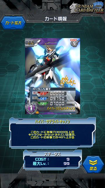 ガンダムX魔王 名無しさんからの提供カード 何と提供は今年の1月!…申し訳ない… MAX値は0/14000/10000 射撃3000以上のキャラセットで射撃19600 今回の限界突破対象。限界突破後は 0/15250/11000 スキル発動で射撃22112 紫に足りなかった射撃特化 ガンダムXの名残かサブカラーに茶色 スキルは射撃3000以上が必要だが色を問わないので 専用パイロットのヤサカ・マオが重いと思うなら 他の色の射撃キャラを乗せるなど応用は聞くほう トロワとかロックオンいいんじゃないですか?(適当) 紫も茶も射撃がそんなに潤っている訳では無いので 結構使えるカードかも。 限界突破後は防御は置いておいて射撃が2万超えるのでかなりいい感じ ガンプラ心形流とかいう流派のマオが使うガンプラ。 通常月が出ていないと使えないサテライトキャノンだが 心形流にかかればそんなデメリットも無くなり撃ち放題に。 自分の名前マオにかけて魔王と付けており 次の機体もクロスボーンガンダム魔王。 胸のドクロからサテライトキャノンを撃つ怪しい機体になってしまったので 普通にX魔王のほうが私は好きです。 というか肩から担ぐ本家よりも 腰から伸ばすビームカノン的な撃ち方が好きなので本家Xよりも… [1回]