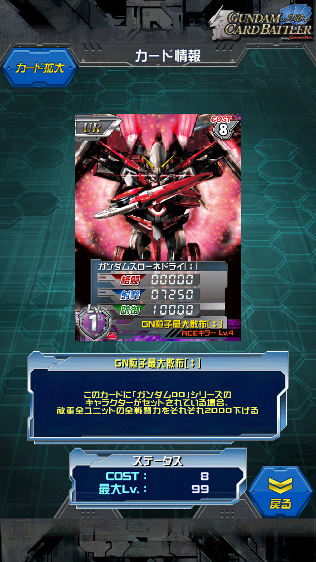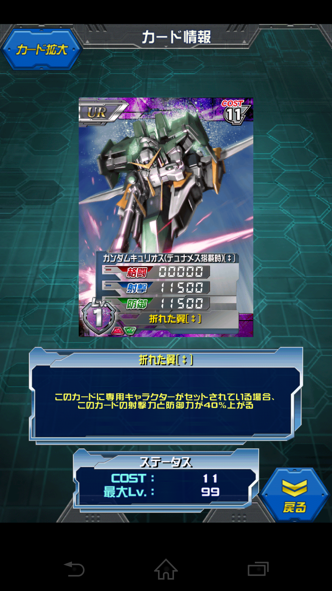 ガンダムキュリオス(デュナメス搭載時) 明日からはGレコですねぇ。 それではzeroさんからの提供カードです。 限界突破状態のカード提供 MAX値は0/16500/16500 専用キャラセットで0/23100/23100 コスト11だけあってかなりのステータス。 ユニットだけで2万の時代が来ましたね… 専用キャラなので万能で行くならアレルヤ 射撃を伸ばすならロックオン、でしょうか UR刹那&ロックオンでも乗せれればいいんでしょうが コスト9はさすがに重い、場合はコスト5辺りのロックオンで我慢しましょうか。 今後はコスト11のURがポロポロ出てくるんじゃないかな、と思います。 LRはキャラステータスがモロに反映され URは固定値上昇、といった住み分けになる・・・かもしれませんね これいつのシーンだろう…思い出せない、まぁいいや(笑) カード名からするとキュリオスがメイン、デュナメスはオマケ。 よくキュリオスは電池と呼ばれていますが このカードではドダイですね。 高機動で飛び回るキュリオスの上に乗りながら狙い撃てるロックオンが凄い! ということを感じさせる1枚です。 キュリオスもきっと凄いんでしょうけど 4機の中で一番地味ですよね… [3回]