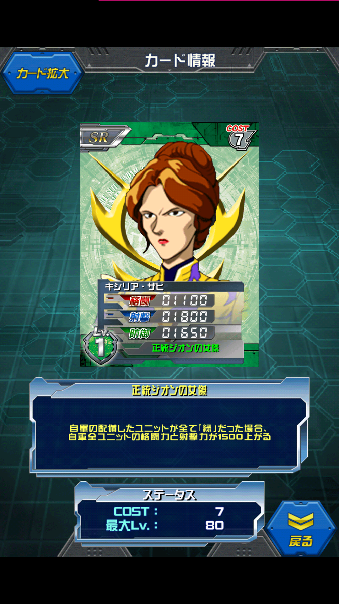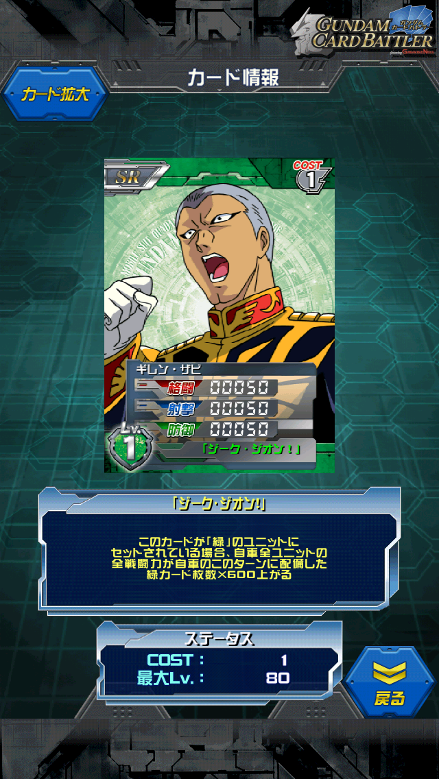 ギレン・ザビ 「あえて言おう、カスであると!」 星一号作戦 撃墜数500報酬です。 MAX値は驚きのALL100 乗れる機体があるのかも分かりません とりあえずビグザムはダメでした・・・ ただ恐ろしいのはそのスキル ややっこしい書き方をしていますが 緑一色なら600*3*3体分なのでALL5400上昇することになります。 なのでギレンはコスト1の5500/5500/5500に。。。 専用機がないとしても異常な数値 緑デッキには必須。。。 ただ全部埋めるわけにはいかず さすがにコスト5、専用機セットなら6000のパイロットがいるため 必ずしもセットすればいいというわけではありません 専用パイロットがいない、又はパイロットが悪くて 機体が生かされていない場合に乗せるといいと思います。 ぱっと思いつくのはイフリートとかかな? [1回]