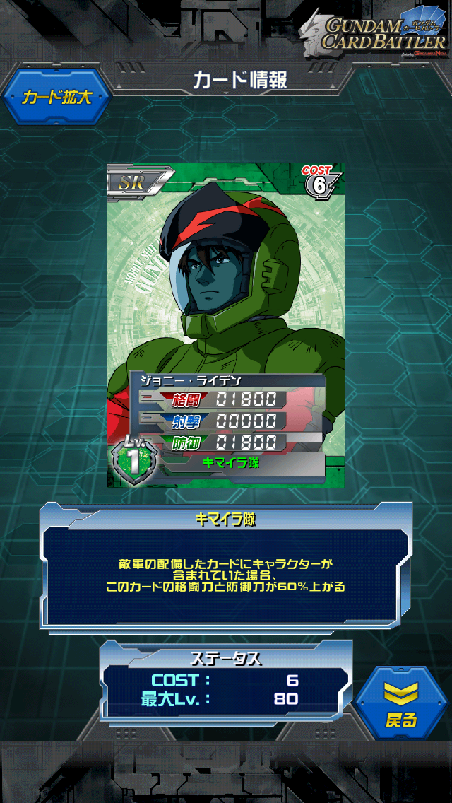 ジョニー・ライデン 戦場は荒野 赤コンテナ景品 シャアの影武者...ではなくきちんとしたエースパイロット MAX値は3250/0/3250 敵キャラが入れば5200/0/5200 格闘防御5000超えとなかなかの強者 専用機は分かりやすくジョニー・ライデン機と記載してある 記載のないユニットに適正があるのかは調べてません 今回の機体にマッチし、機体キャラ共に無駄な射撃を省いているので 攻撃防御安心して使えます ただ、緑で欲しいのは射撃なんですよね(汗 真紅の稲妻の二つ名を持つパイロット アニメ派の方は「誰これ?」でしょうがMSVでは有名なほう 同じ赤色の機体(シャアはピンク寄りですが)なので連邦軍から 間違われることもしばしば むしろ自軍からも間違えられ撃墜数の数がシャアに加算されているとか。。。 [2回]