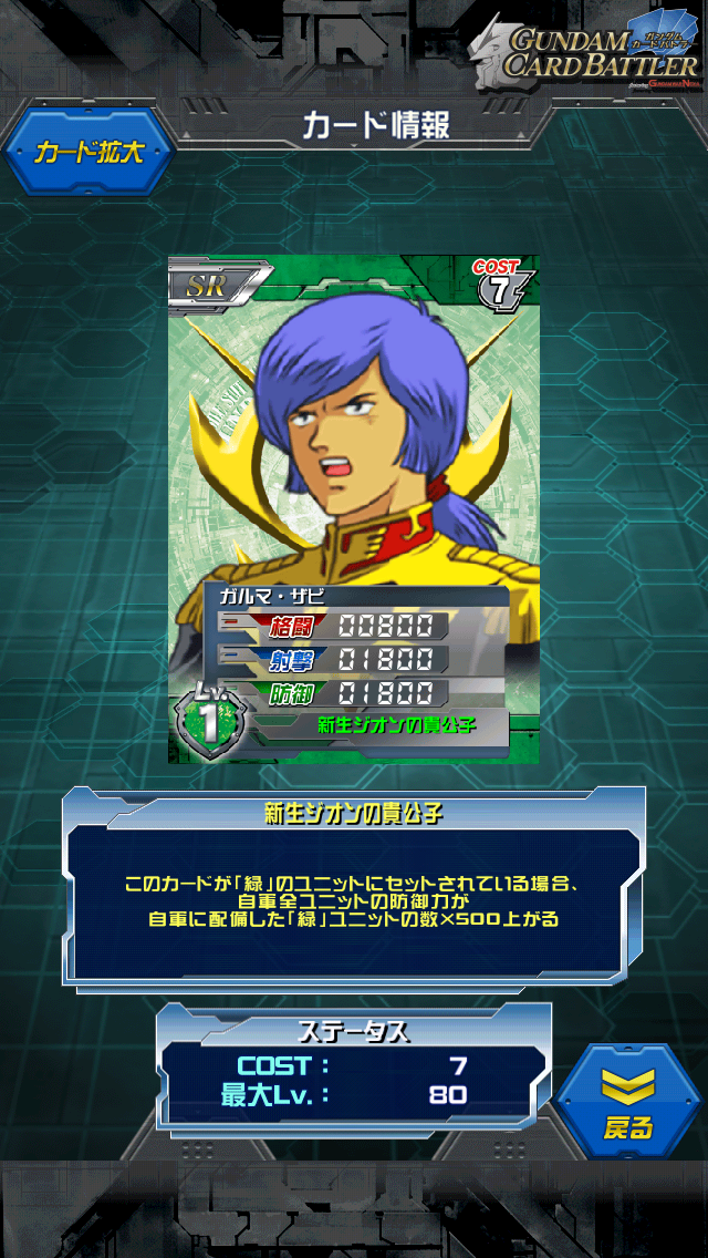 ガルマ・ザビ 戦場の荒野 緑Gサイン200個交換景品 ザビ家のお坊ちゃん、色々と有名な彼です。 MAX値は1500/3250/3250 場が全て緑なら防御が実質4500アップでなんと7750に 防御特化のステータス カガリやバーンズとは比較にならないほどの防御キャラ ...しかし乗せる機体に困る 緑の防御と言えばジョニーゲルググやドアンザクですが 両方とも専用パイロットが必要なユニット うーん、他のザビ家パイロットに言えることですが 乗せるユニットが限られてくるのは痛いですね 専用機は現在ロクなものが無いので 基本ステータスは射撃も高いことを生かして パーフェクトジオング辺りが良いかもしれません シャアの有名なセリフ「坊やだからさ」の坊や 七光りだのお坊ちゃんだの言われたい放題 シャアとは良い友人関係だったらしいが ザビ家に復讐を目論むシャアの策略によって ホワイトベースに撃墜されることに 「図ったな!シャア!」 [4回]