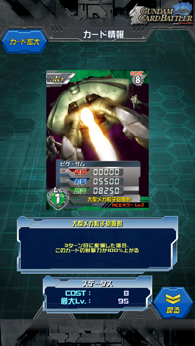 ビグザム 星一号作戦 ACEドロップ 緑の防御ユニット!・・・と思ったら・・・ MAX値は0/8000/11750 3ターン目は射撃2倍で16000です。 3ターン目以外は防御ユニットとしても活躍できますよ、きっと・・・ ドズル次第ですが今の緑では貴重なユニットではないでしょうか こういう3ターン目倍スキル持ちの欠点として オートでは考慮してくれないのが残念です。 ソロモン戦でドズルが搭乗した1stで一番インパクトのある機体 「戦いは数だよ」と言っておきながら乗る機体は 一機で何隻もの戦艦を落とし、倒したMSは数知れず しかしフル稼働での活動時間は20分ぐらいが限界とか これをジャブローに落とす計画で足が付いているとかどうとか [0回]