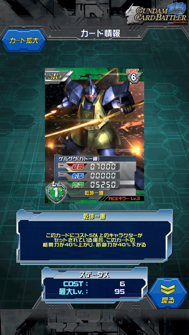 ゲルググ(ガトー機) 星一号作戦 前半戦シークレットACEです。 MAX値は10000/0/7500 コスト5以上のキャラセットで格闘が上がり、防御が下がるユニット と言ってもスキルが発動しなければ平凡ユニットで終わってしまうので 是非ともコスト5以上のガトーを乗せたいところ どこからどう見てもザク改のコストアップ版 キャラが乗った場合は14000/0/4500 安定した格闘値をこのコストで出せるのは大きな強み 防御が0のガトーを乗せれば誤って防御に出る可能性も下がります 後から設定で追加されたガンダムお得意のMSV機体 ガトーがもしア・バオア・クー攻略戦でアムロと遭遇していたら歴史は変わっていたかも とかいうifもあったようななかったような… [0回]PR