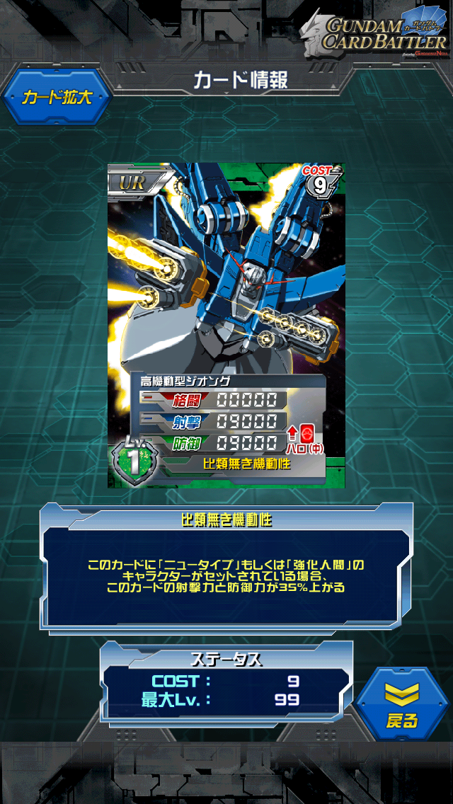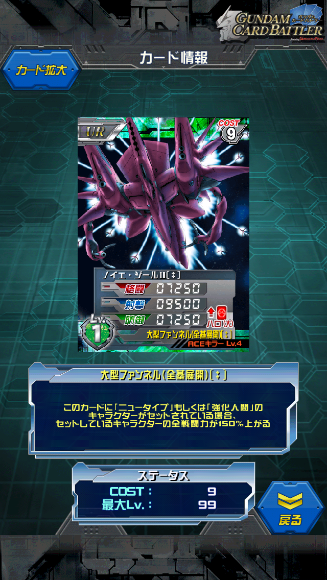ノイエ・ジールⅡ〔‡〕 待っていた方も多いんじゃないでしょうか ノイエⅡの限界突破です。 MAX値は10500/13750/10500 セットしたキャラの150% 例えばALL3000なら4500上昇で15000/18250/15000 限界突破してようやくマシになったノイエⅡ 赤のマルチカラーでも付けてくれたらいいのに… 緑単だとコスト8のケンプファー(ALL17500)がいるとは言え URの少ない緑ではかなり戦力になるのでは? ただステータス自体は射撃寄り平均ユニット。 その自慢の射撃もよっぽどのキャラを乗せないと 他の色単コスト9に負けてしまう悲しいステータス。 シャアでなくてもNT、又は強化人間で発動するため リスクはありますがカリス(0/5000/5000)を乗せるとか…無いか(;'∀') たぶんGジェネからの登場MA。 アクシズの作ったノイエジールの後継機。 もしもシャアがアクシズから地球圏に戻らずに アクシズの総帥とした場合乗ることになっていたとか… 武装は有線クローアームからファンネルに進化。 正面から見た姿がネオジオンのエンブレムに…見える? [3回]