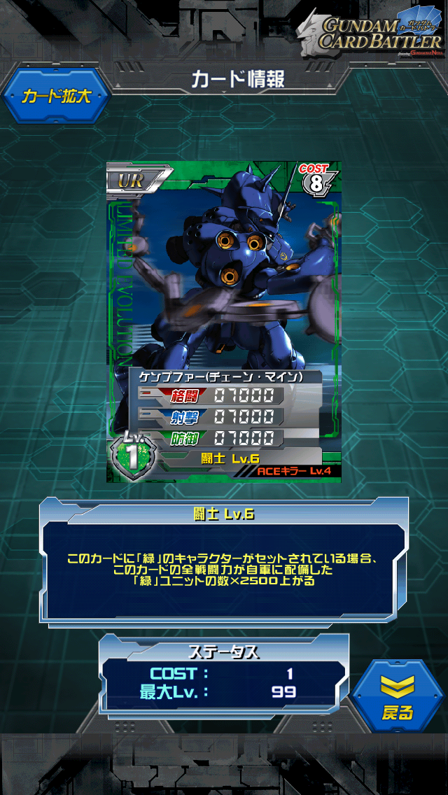 ケンプファー(チェーン・マイン) 第4回限定強化イベント 強化対象 プロトタイプケンプファーからの最終進化。 MAX値はALL10000 緑キャラセットで自軍の緑の数だけ強化され最大ALL17500 コストが下がった緑版ゼクツヴァイ。 緑単にとってはパオングの代わりに十分置き換えれる性能。 いいのか悪いのか分かりませんが何で緑だけコスト8…? 緑キャラでいいので今回のサイクロプス隊の方々はもちろん 専用キャラでもNTでも強化人間でもないため使いにくかった ギレン、デギンでもOKです。 緑は専用キャラを要求するURが多いため嬉しいところ。 ポケ戦の…残念ながらアレックスの引立て役。 スカーレット隊を瞬時に全滅させたまでは良かったが アレックスにチェーンマインを巻き付け爆破したがチョバムが壊されたのみ。 その後アレックスのガトリングで蜂の巣にされてしまう… サイクロプス隊は現地でケンプファーを組み立てていたが そんな簡単に分解・組み立てができるものなのかなぁ。 ケンプファーと言えばこのチェーンマイン、 特に0080以降似た武器すら使われていないマイナー武器… でしたがユニコーンで再登場。 まぁ…壁破壊して終わりでしたが [1回]