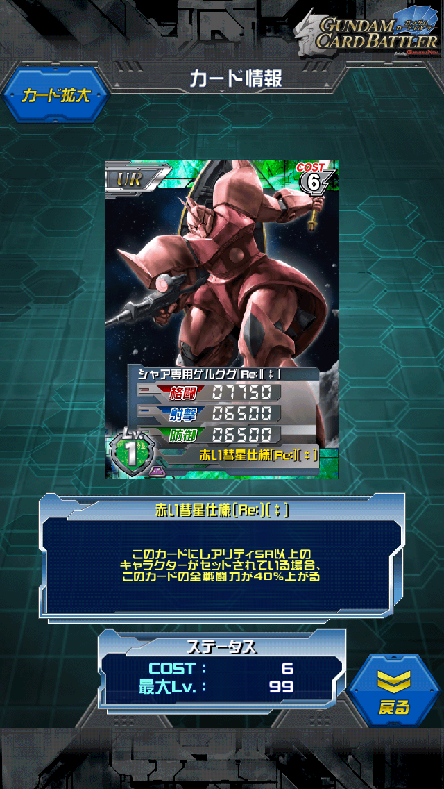 シャア専用ゲルググ[Re]〔‡〕 シャア3点セットの最後の1枚 元々はプレミアムガシャ産だったかな MAX値は11000/9250/9250 SR以上のキャラセットで15400/12950/12950 昔は厳しいスキル条件でしたが 今はSR以上なんて当たり前の時代。 キャラ乗せればほぼ発動するド安定スキルです。 コスト6で格闘15000超えて、さらに射撃防御もあるというところは 評価されていいと思う… 緑URシャア自体もコスト5と軽いのでセットすれば コスト6/5 22400/19950/19950 おぉ…お買い得ではないですか?(笑) シャアのザク、ズゴックに続く赤色MS。 ただしこの頃になるとアムロがNTに覚醒してしまったので どちらかと言うとあまりいい場面も無く終わってしまった機体。 ゲルググ自体は1年戦争終期に量産されていたが ベテランパイロット達は使い慣れたザクやドムを選び 慣れない学徒兵達が乗ったため性能を十分に発揮できなかったとか スペック自体はガンダム同等、という話を聞きますが…果たして… [4回]