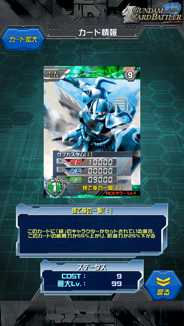 グフカスタム〔‡〕 今回の限界突破ユニットシリーズ第3弾 なんか緑のカード紹介するの久しぶりな気がする MAX値は14250/0/13000 緑キャラセットすれば22087/0/9750の格闘バカ 緑キャラを乗せるだけで格闘が2万超えるシンプルなユニット。 今回のノリスも格闘バカなのでセットすれば コスト9/7で31337/1000/12250 なんと3万オーバー。うまくいけばLRにも勝てる…かもしれません。 防御は察してください(笑) ステータスを下げて1つを特化させるのは2号機と似てますね。 ただ専用パイロットを乗せる必要が無く 2万超えるステータスを持てるコスト9というのは 中々使いどころはあるかもしれません。 穴埋め…にしてはユニットコスト重いですが パイロットコストがキツくてユニットにゆとりがあるのなら 入れてみてもいい1枚かもしれませんね。 08小隊で登場したアイナの親代わり、ノリスの機体。 「娘さんを、僕にくださぁぁぁい!」 と叫びあげるシローのEz-8と交戦。 シローとの生死をかけた勝負よりジオン兵を逃がすためのガンタンクの撃墜を優先する。 「勝ったぞ!」のセリフ通りシローとの勝負は 負けたが目的は達成した形となった。 ガトーと並ぶジオンの漢。 アイナで説得できるのはスパロボお馴染みのイベント [2回]PR
