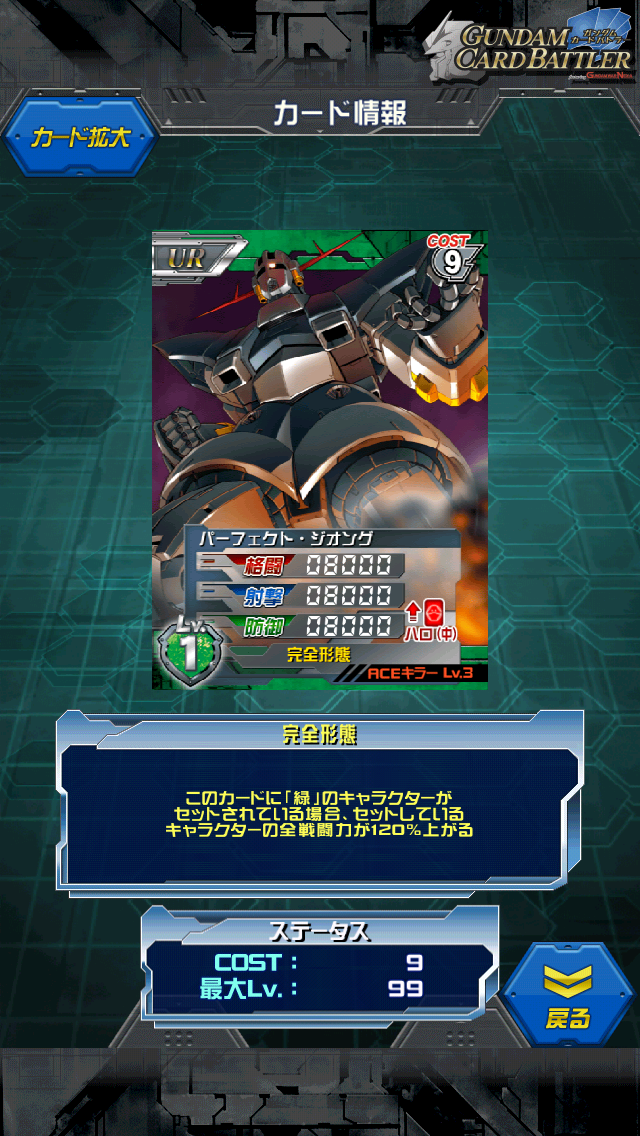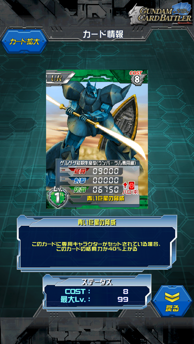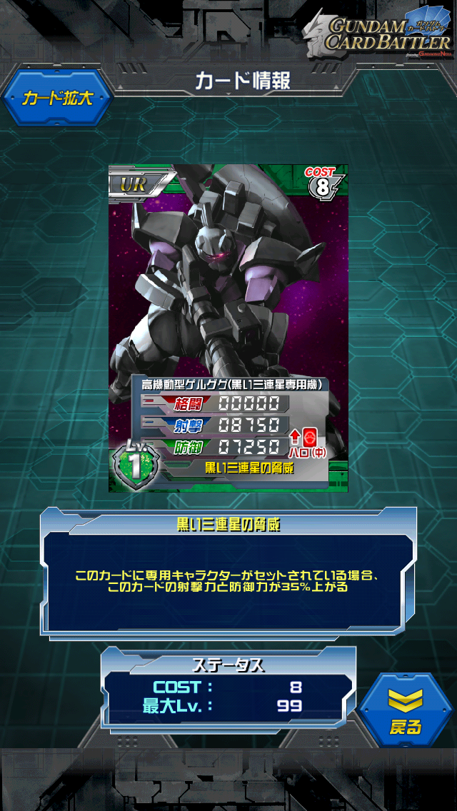 高機動型ゲルググ(黒い三連星専用機) 高機動型ゲルググ(黒)+ジオニズムの開発ユニット またしてもifな機体 MAX値は0/12500/10500 ガイア、オルテガ、マッシュ誰かが乗れば0/16875/14175 緑では貴重な射撃ユニット ただ乗れるキャラが緑キャラではなく専用キャラと限られてしまうのが辛い 黒い三連星は格闘の3000が勿体ないので コスト6でいいので射撃防御の三連星が欲しかったところ 選ぶならGサインのマッシュが射撃寄りで良いかと このカードにマッシュを乗せて格闘機に三連星でスキル条件が満たせれば 低コストキャラでかなりの火力が上げれるんじゃないかと ・・・手札に来ないと辛いですけどねー ゲルググ開発前にアムロに撃墜されてしまったので 実際は乗ったことも見たことも無いのでギレンの野望のif機体 元々黒い三連星はルウム戦役という宇宙戦にてザクで戦果を挙げているので 宇宙でも全然戦えたのでしょうね この機体でもジェットストリームアタックするんでしょうねぇ [2回]