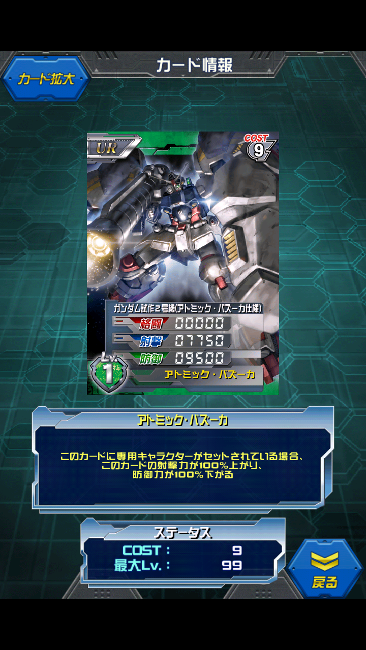 ガンダム試作2号機(アトミック・バズーカ仕様) Sさんからの提供カード 私はこの頃フルバーニアン取得に必死だったので 2号機は完全スルーしてました(;´∀`) 0083 アナハイムロゴガシャ景品 核と言えば2号機、カード名に書くと長すぎるせいか書かれていませんが コード名はサイサリスです MAX値は0/11000/13500 専用キャラ…いわゆるガトーが乗れば射撃が100%上がって防御が100%下がるという ピーキーな機体 というかガトーを乗せないとただのコスト8辺りの射撃防御機に成り下がるので 「乗せない」選択肢はまず無いかと… ガトーが乗れば0/22000/0という半壊リガズィ強化版 コスト9ながら拡散サザビーよりも射撃が高く、3ターン目のミーティア自由に迫る射撃値 間違いなく現時点では射撃の王者、射撃不足の緑に現れた救世主… と言いたいところですが 1つの事しかできない高コストは使いづらかったりします。 最大ダメージを目指すのでしたら3~4積みでもよいかと思いますが 防御事故のリスクは非常に大きいです。 また、最初から0ならよかったのですが変に高いだけの使えない防御13500が邪魔で オートでやれば防御ターンに出てしまい、 アリーナ戦では相手から見るとラッキーキャラです。 使いどころを間違えてしまわないようにお気を付けください。 やっと出てきた核を積んだ2号機 でっかい盾は冷却装置が積んであり、核発射後に機体を守る役目があるため 盾が無いと発射した2号機自身も危ないわけです。 話は変わりますがSDガンダム外伝のサイサリスは盾に操られている設定 奪われる=操られる、とこじつけたナイスな設定になっています [0回]