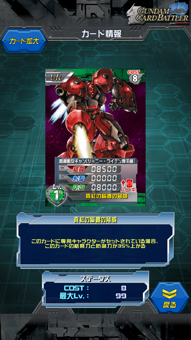高機動型ギャン(ジョニー・ライデン専用機) 高機動型ギャン(ジョニー・ライデン専用機)+ジオン驚異のメカニズム 結構開発は長いので途中は端折ります MAX値は12000/0/11500 専用キャラセットで16200/0/15525 今回のライデンさんセットで コスト8/6の22400/0/21725 通常のギャンとの違いは防御値 格闘だけ欲しいならアチラですがこちらは格闘防御機 デッキと相談して入れてください 専用キャラセットとなっているので自然と今回のライデンさんを 乗せる以外選択肢がありません さすがに前回の防御ライデンさんは格闘が勿体ないし… MSV?ギレンの野望?とりあえず知りません(汗) ギレンの野望ではジオンの次期主力MSをゲルググかギャンかで選べるそう ギャンにするとこういったエースパイロット専用ギャンや ギャンの派生機種が生産できるようになるそうで 面白そうだなーと思っているのですが あのシミュレーションに慣れるまでが大変そう… [3回]
