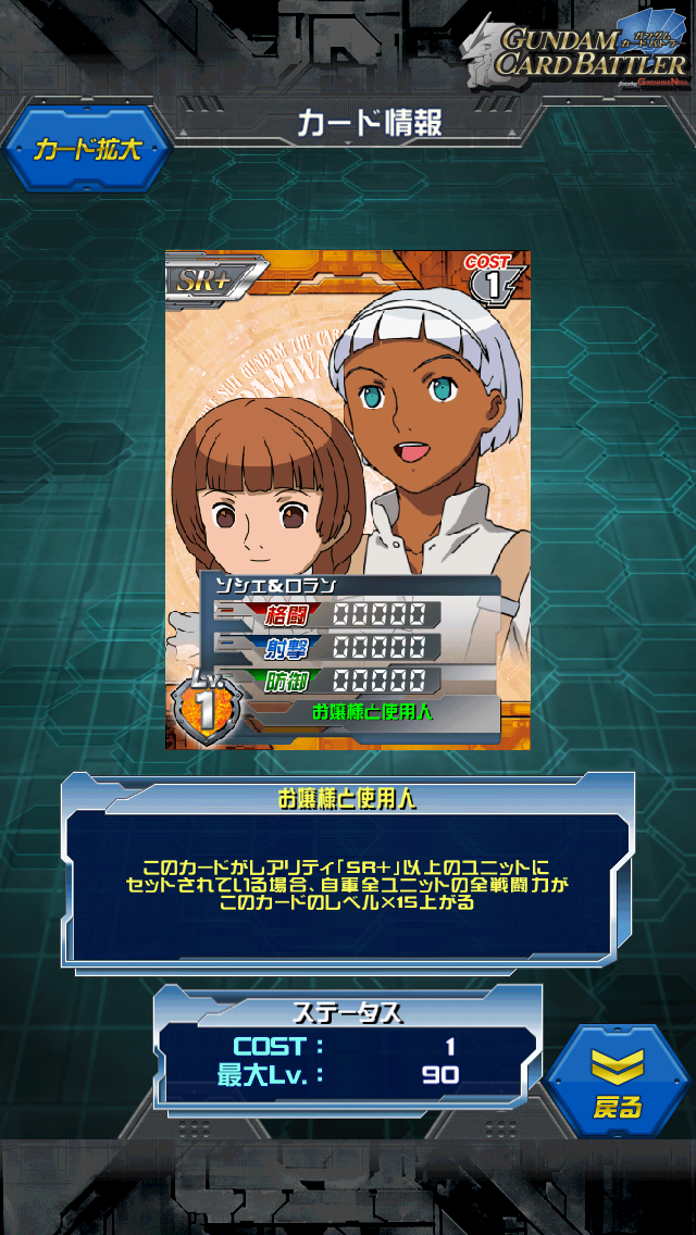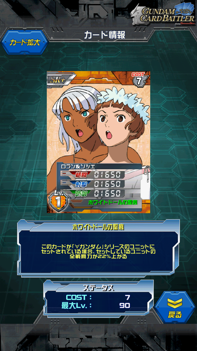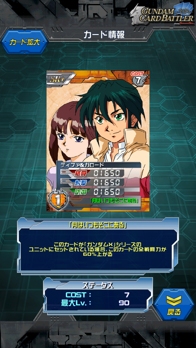 ティファ&ガロード hideさんからの提供カード Xファンでしたら持っておきたい一品ですよね ガンダムXイベントのイベントコンテナ景品 ガンダムシリーズ通して清々しい純粋なカップルです MAX値はALL3000 ガンダムXシリーズにセットすればALL4800です。 ティファの適正とガロードの適正があるので ガンダムXはもちろん アシュタロンにも乗れますし、さらに言うと ヴァサーゴ&アシュタロンにも乗れる…と思います。 何でも乗れると言ってもド平均ステータスを生かすにはド平均ユニットに乗せるのが一番 開放するものやUR DXなどがいいと思います。 ド平均ってコスト7でもステータス5000を超えないのが残念です。 最近はコスト5で1つステータス0、1つ5000超えというのがワラワラ出てきているので 過信しないように ガンダムXはガロードとティファのボーイミーツガールなストーリーです。 ガンダムのバカップルと言えばこの2人がまず挙がります 最初から最後までイチャイチャしたのはこの2人と シロー&アイナぐらいでしょうか ちなみにカードのスキル名はガンダムX最終話のタイトル ガンダムXの各話のタイトルはその時の誰かのセリフが そのままタイトルに使われているのが特徴です 第1話:月は出ているか 最終話:月はいつもそこにある うまく纏め上げた感じですよね [1回]