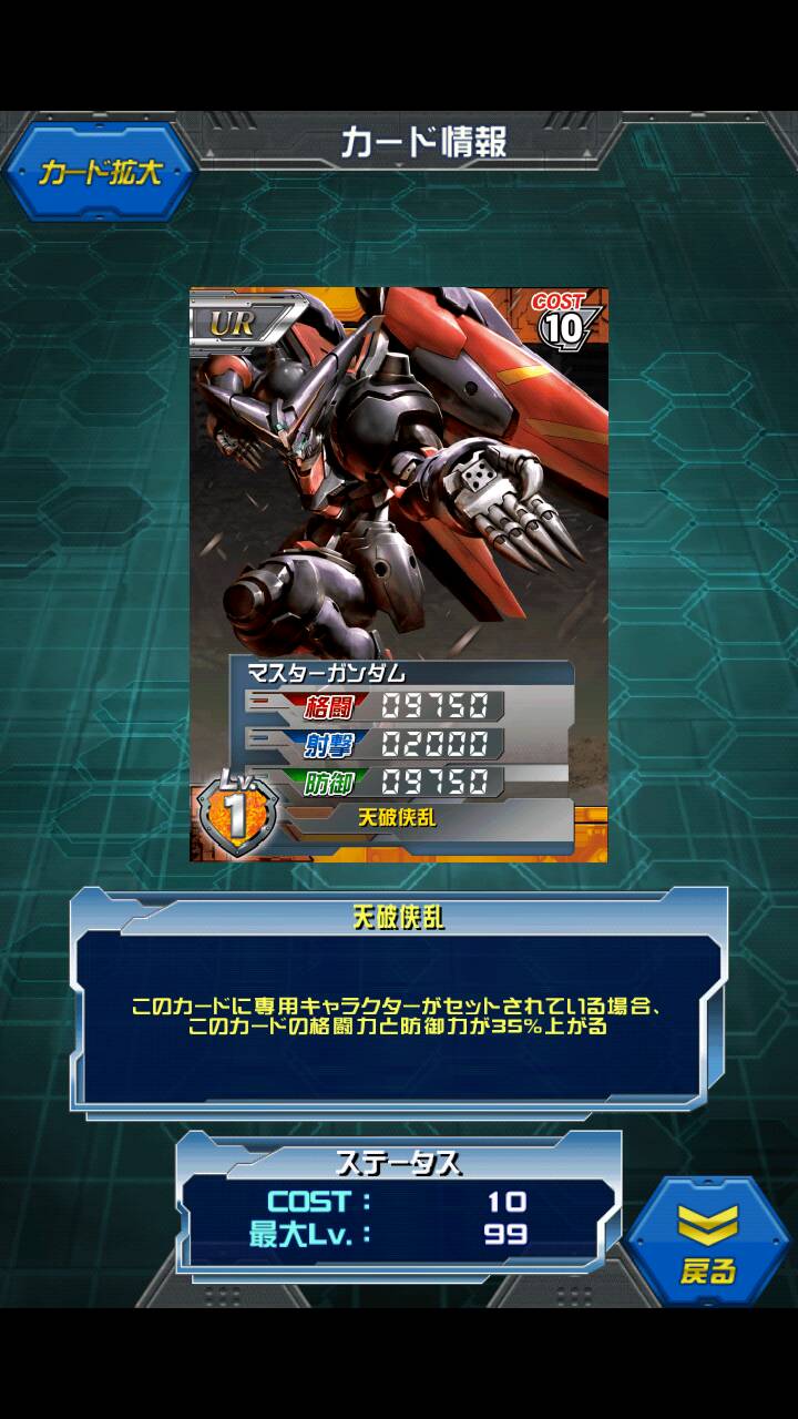 マスターガンダム 第一回バトルアリーナイベント6000P達成報酬 師匠の扱う黒いゴキブリマスターガンダムです MAX値は14000/3000/14000 師匠セットで18900/3000/18900です 茶色デッキの方にとっては 「また格闘防御URかよ!DX(Gファルコン合体時)とか射撃機だせよ!」 と思っているかもしれません トップクラスの格闘を持ちながら防御も出来るところがゴッドとの差 逆に防御はターンXトップに任せるからいらねぇ!という人には ゴッドのほうがコストも低くよいかもしれません 師匠のステータスは基本的に格闘寄りなためどれでもいいですが これを入手している人は愚か者師匠も取れているはずなのでご一緒にどうぞ ちなみに愚か者師匠とセットで25425/4500/25425です 実は師匠の機体2機目 前回ガンダムファイトではクーロンガンダムという地味なMFで戦っておりました 流派東方不敗は布が得意なようで師匠のマスタークロスはもちろん ドモンも鉢巻を武器?にできるよう マスターガンダムが剣を使わないところを見ると ゴッドスラッシュタイフーンとかはドモンのオリジナルなのですかね [0回]