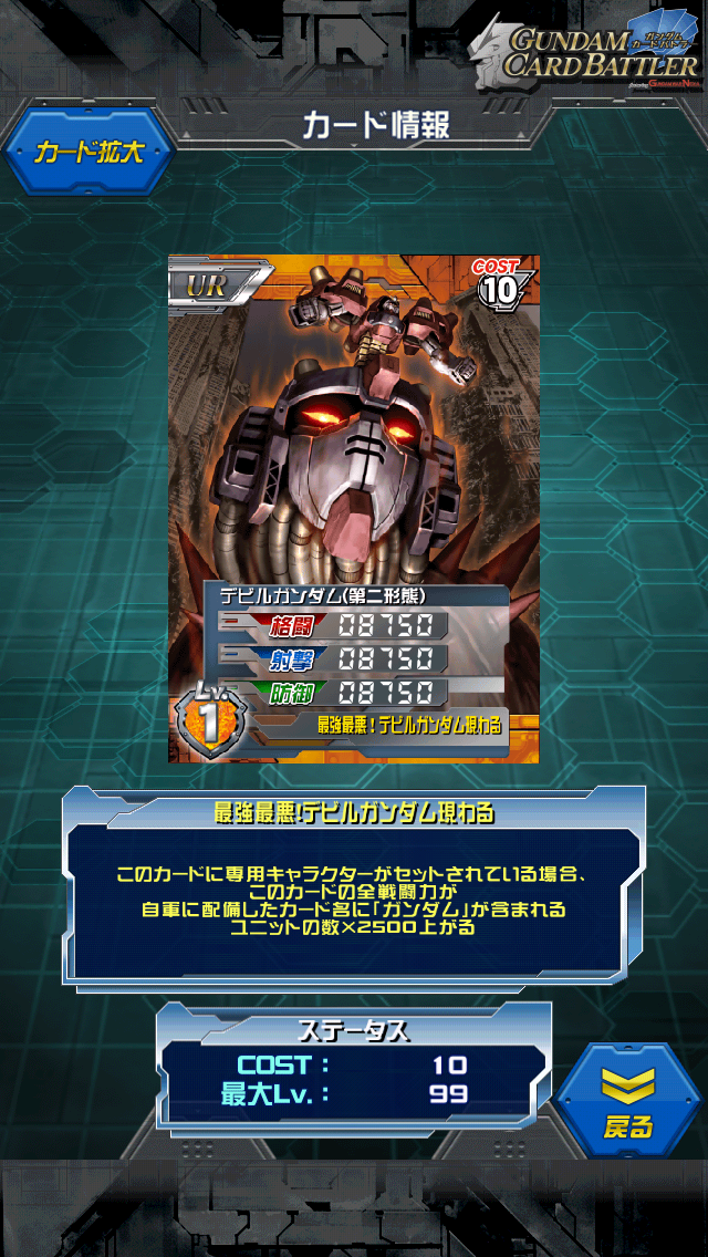 デビルガンダム(第2形態) 第2回バトルアリーナ7000P達成景品 バトルアリーナ=茶イベントとなりつつありますね MAX値は12500/12500/12500 スキルは自軍の場のガンダム×2500上昇するので 最大ALL20000となります。 コスト10でALL20000という数値を見ればかなりのステータス ただキョウジの時同様に場がガンダムと言う条件が辛い 格闘枠は茶には腐るほどいますが 射撃枠はガンダムDXやX、ヴァサーゴ等で補う必要があります。 使いやすいベルティゴ、シャッフル同盟が封じられるのは痛いですが 茶デッキには十分活躍するカードではないでしょうか また、専用パイロットを今回のキョウジに拘る必要がなく 普通にコスト1キョウジでもスキル発動条件を満たせるので パイロットコストの節約にもなります。 逆に今回のキョウジはターン数を重ねる=山札のガンダムが減る毎に弱くなるため ターン数で強化される自己進化デビルとは相性が悪いです その名の通りデビルガンダムの第2形態 見た目以外何が変わったのかはサッパリですが 自己進化の能力を使って進化しているのでしょう 基本的な武装な拡散ビーム デスアーミー、ガンダムヘッド等を生み出すことがお仕事 最終進化ではコロニーと合体するのだがそれはまた別の話 [1回]PR
