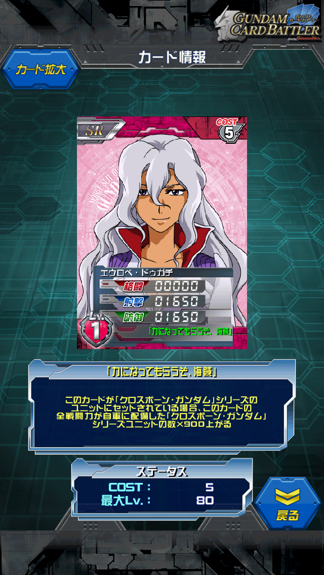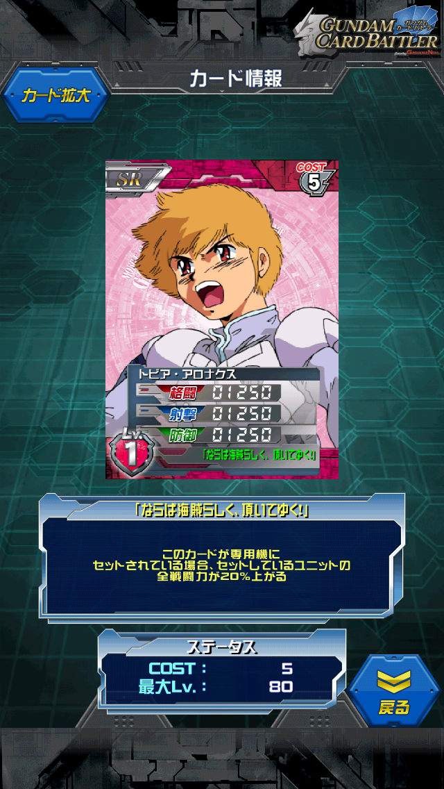 トビア・アロナクス 「ベルナデット、今約束を守る!」 クロスボーンガンダムの主人公トビア君です。 クロスボーンイベントポイント350P交換景品 MAX値はALL2500とド平均ユニット 乗れる機体はほぼ格闘機体なのに・・・ 機体の能力を引き出すタイプ ステータス自体はコスト5の中で特出しているわけではないので いかに強い機体に乗せるのかがポイント 少なくとも10000オーバーの機体に乗せれば トビア君も満足してくれると思います。 [1回]