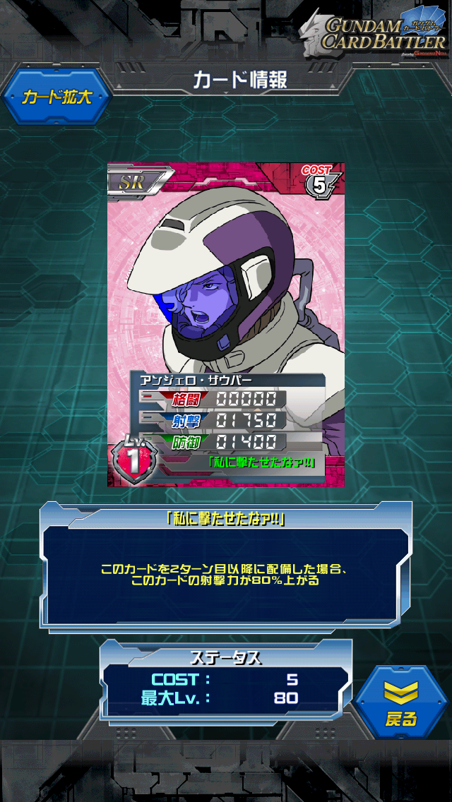 アンジェロ・ザウパー 第一回バトルアリーナイベント350P交換景品 見ているだけで援護しないことに好評なアンジェロさんです MAX値は0/3250/2500 以前はフロンタルが場にいないとやる気を出さない使えない奴でしたが 今回は2ターン目以降という条件で射撃が5850という 何気にコスト5射撃値トップじゃないのか?と思う数値になります。 2ターン目以降...なので自分が実感するのは実質3ターン目のみ、、、 と思いきや今回のイベント防御の日は2ターン目が攻撃射撃になるため 3ターン目アップとは違うところを見せてくれるはずです。 今回のアンズール最大(アンジェロ、ギラズール、最大出力)に乗せると 1ターン目は射撃18250ですが2,3ターン目は20850と2万を超えてきます コスト6で2万を超えるのはなかなか貴重だと思いますよ 大佐の邪魔をしてはいけない、と言いつつもNT-Dが発動したユニコーンの圧力に負け 援護してしまった時のセリフ バナージへの怒りもありますが、撃ってしまった自分にも怒っているところを感じさせます。 「大佐は人を超えられた方だ!」と要所要所に危ない発言があるフロンタル教の信者 シャアの再来としてのフロンタルではなく フロンタル自身に惹かれているところが他の有象無象とは違う点 …薄い本に狙われている…かもしれません [0回]