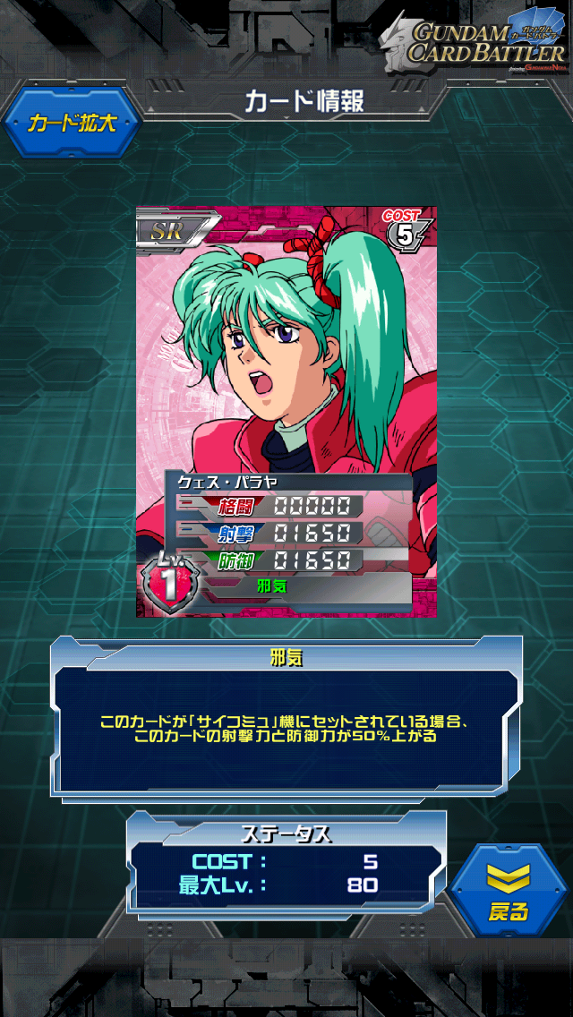 クェス・パラヤ 第一回バトルアリーナイベント350P交換景品 我儘ファザコン娘 クェスです MAX値は0/3000/3000 スキル発動で0/4500/4500とよく見る数字 αは持ってるけどクェスが手に入らなかった人には朗報なのかもしれません コスト6クェスに比べると射撃値が貧相ですが コスト4のR+を使うよりかはかなりマシです ステータス自体は今回のガトリングヤクト向きな数値 インドで修業したニュータイプ アニメではハサウェイを庇ってリガズィのミサイル一発で落ちてしまいました ガンダムイボルブという映像作品では 逆にハサウェイを撃ってしまい後悔しているクェスをアムロが説得し クェスがハサウェイを助けに行く。。。といったハッピーエンド寄りな内容です。 ちなみに小説閃光のハサウェイではララァのようにハサウェイに憑りついています [1回]