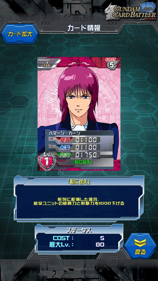 ハマーン・カーン 第一回バトルアリーナイベント 2000P達成景品 髪形の違うハマーンさんです MAX値は2000/2000/3500 いつもの射撃ハマーン様ではなく守りに入ったハマーンさんです。 前列に出れば実質防御は6500 赤で不足気味の防御が高いのはいいのですが 残念ながら前列時のみ発動するスキルなので何枚も積むのはちょっと勿体ない 実はこの回のアニメ見てないんですよ なのでなんで髪形変えているか、とか知りません けどこの髪形だったら誰かわかりませんよね… [0回]