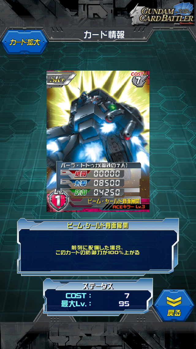 バーラ・トトゥガ(鋼鉄の7人) SRトトゥガ+ガンダムF90Sタイプの開発ユニット アビジョ同様に黒から赤になりました MAX値は0/12000/6000 前列配置で防御が100%アップ、つまり12000になります。 防御特化、かと思いきや実態は射撃防御機 キャラが乗らなくても発動するスキルは魅力ですが 前列配置が何気にキツイ オートでやればほぼ配置されない、又は後列配置ですし 前列は1枚だけなので重ねることもできないデメリット持ち 射撃防御12000として見ればコスト相応かな、と思いますが パイロットが防御特化なのに実態は射撃防御 その防御も1枚限りで12000とそこまで高くない、と色々と損をしているカード バーンズ大尉は立派なのに… 鋼鉄の7人の1機 死の旋風隊の防御を務める黒い塊 両腕のビームキャノンもそうですが特徴は背中のビームシールド 背面全体を覆うためかなりの防御力を誇る鉄壁ユニット 特攻するギリを庇う形で撃墜 木星帝国のMSはクセが強いせいかなかなか立体化しませんね ・・・まぁ私もそんなに欲しい訳ではありませんが・・・ [0回]