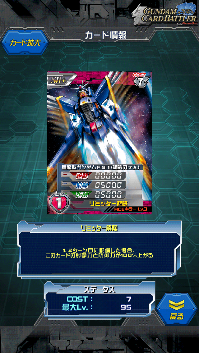 量産型ガンダムF91(鋼鉄の7人) 裏切りの女神ガシャ景品 量産型、でもF91は伊達じゃない! MAX値は0/7000/7000 1,2ターン目なら0/14000/14000です。 こういうスキルはどちらかと言うと 元値が0/14000/14000で3ターン目に半減のほうが色々と使いやすい そういう点では残念 ミッチェル乗せて0/19500/19500と2万超えないことも残念 とは言えコスト7の射撃防御機としてはデメリット持ちのせいでかなり高いほう どのぐらい高いかと言うと同じ青SR+のコスト9フルアーマーZZが スキル発動しても0/13750/13750という数字を見れば 限定的ながら優秀なステータスと言えるのでは無いでしょうか 一番の特徴はトゥインクに適正があることだったり・・・ ドレックが鋼鉄の7人作戦時に乗ったハリソン機 ハリソンが「置いていきます、勝手に使わないでくださいね」との形だけの忠告を受けて 遠慮なく持って行った機体 元々連れていく予定では無かったのでミノルが乗るはずだったので Mのマーキングがされている。 その際に「自分、ミッチェルだから問題ないですよ」と言って 皆を驚かせたワンシーンも [3回]
