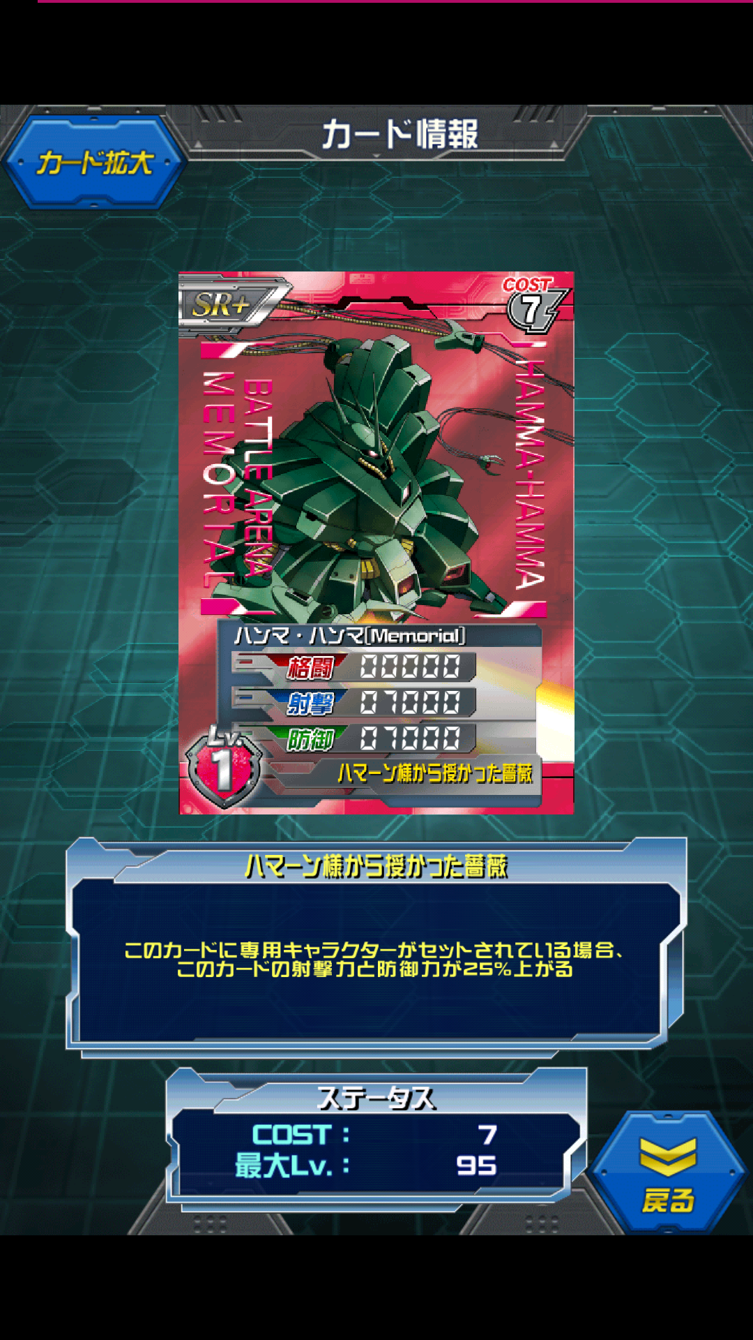 ハンマ・ハンマ(Memorial) 第2回バトルアリーナ 1000P交換景品 エンドラの騎士が使う有線アームの付いたMS MAX値は0/10000/10000 スキル発動で0/12500/12500です。 スキル発動はマシュマーを乗せれば良いだけなので簡単 クェスヤクトに続いての射撃防御機です。 …というかクェスヤクトが赤のキャラだったのに対して こちらはマシュマー限定なのでこちらの方が厳しい割にステータスは同じ マシュマー乗せて使ってください。 よくある射撃防御機と言ってしまえばそこまでですが コスト10UR拡散サザビーよりも防御は(微妙に)高いので 赤の中では防御機としても使えるレベル 射撃防御は数枚入れると役に立つのでいかがでしょうか 冗談のような名前ですがホンマ・ホンマでっせ ・・・ ・・・すみません・・・ ハマーンから授かった変態MS 腕の有線クローアームから放つビームと盾からのビームが武器 そのコンセプトはユニコーンのローゼンズールに受け継がれて 変態意思もマシュマーからアンジェロに受け継がれる(おい [3回]